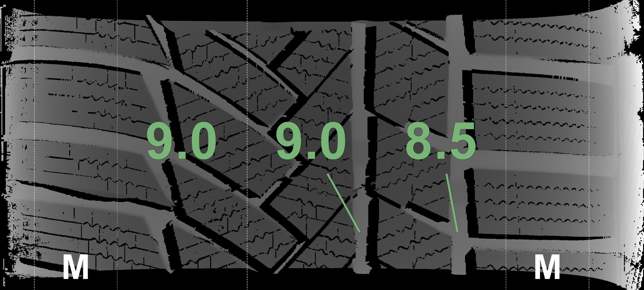 Die gemessenen Profiltiefen und Details der Felgen sind oben abgebildet.