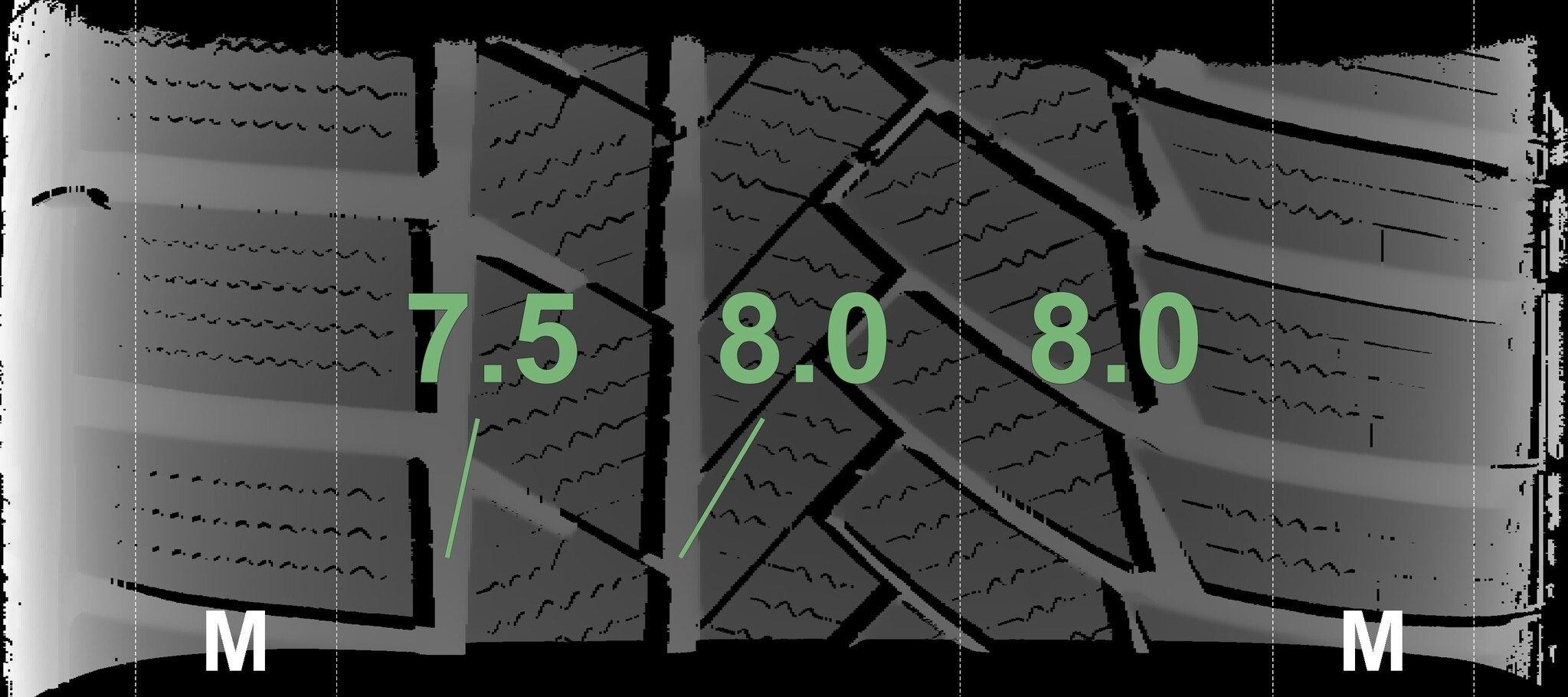 | Zustand | Profiltiefe | DOT | Hinterachse Rechts | Gebraucht | 8.0 mm | 2124 |