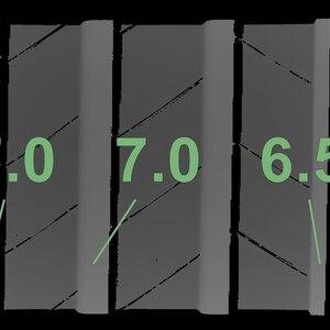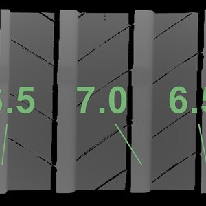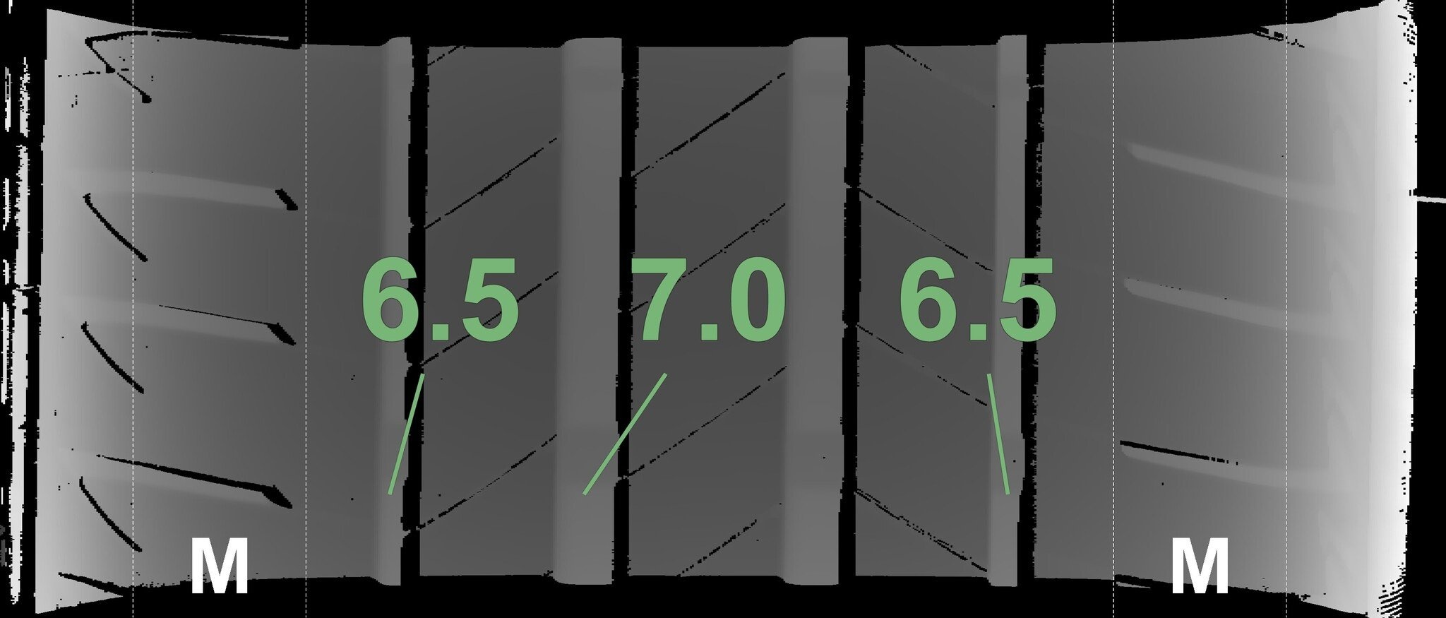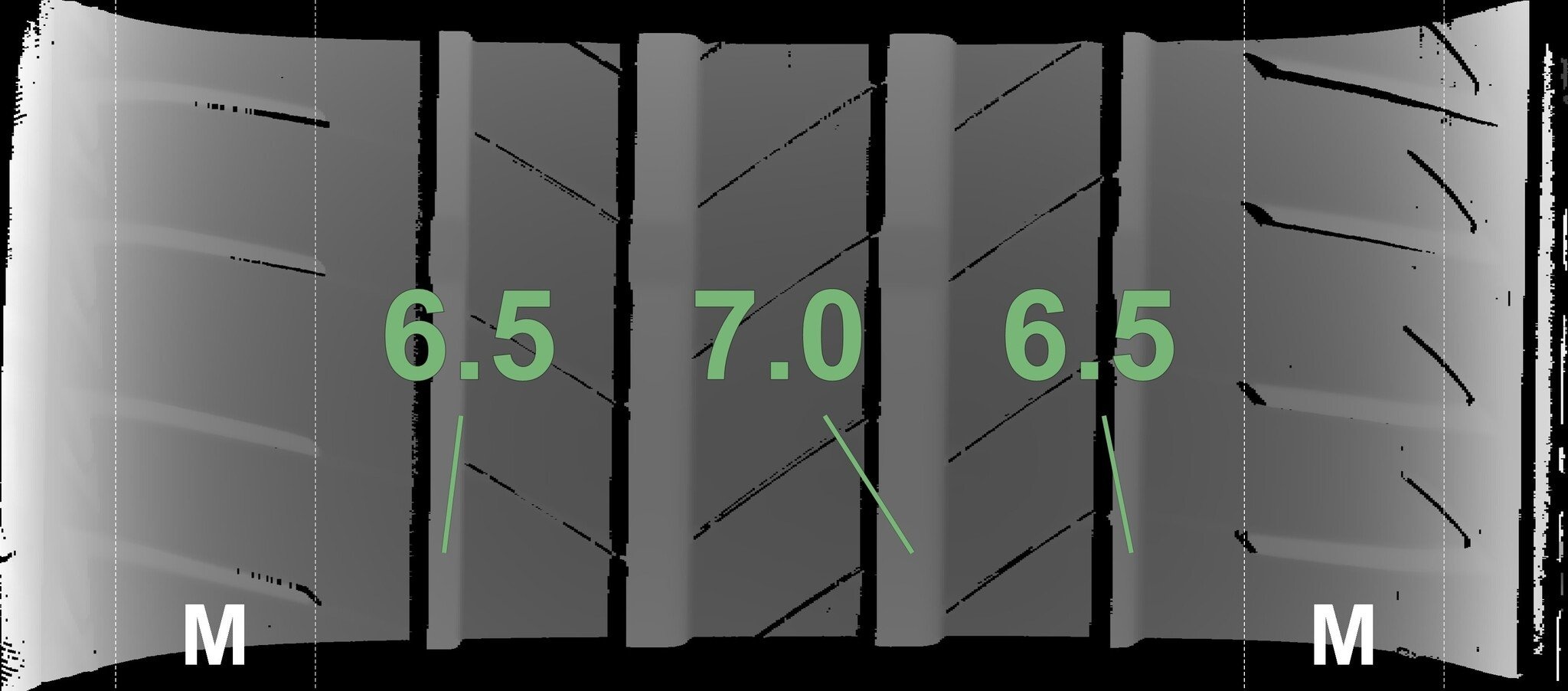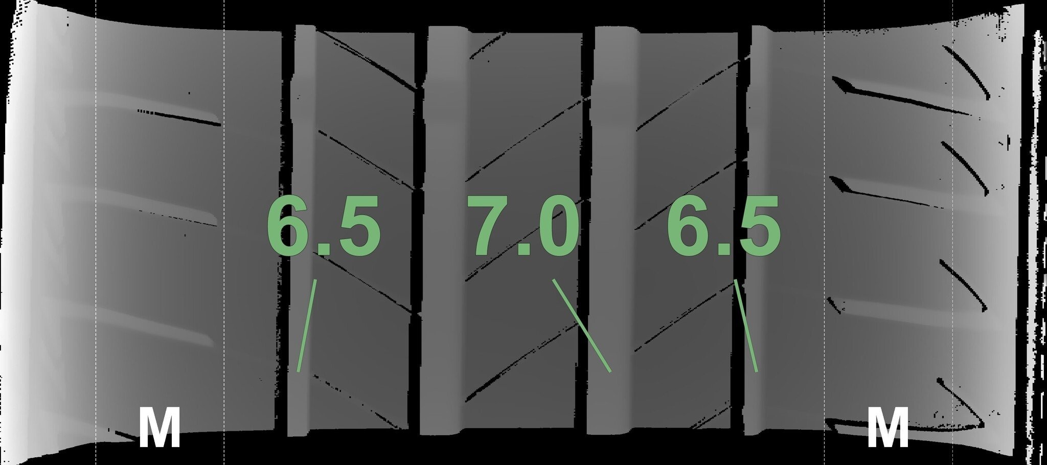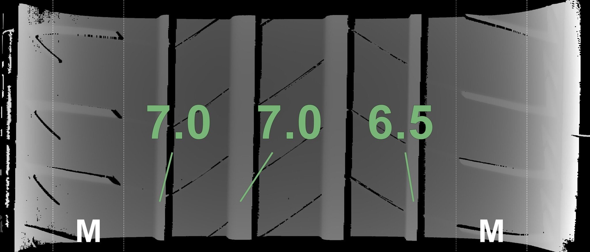 Die gemessenen Profiltiefen und die Details der Felgen sind oben dargestellt.