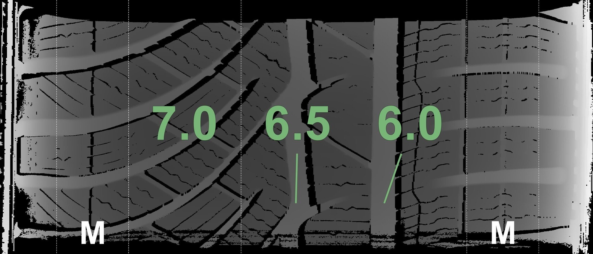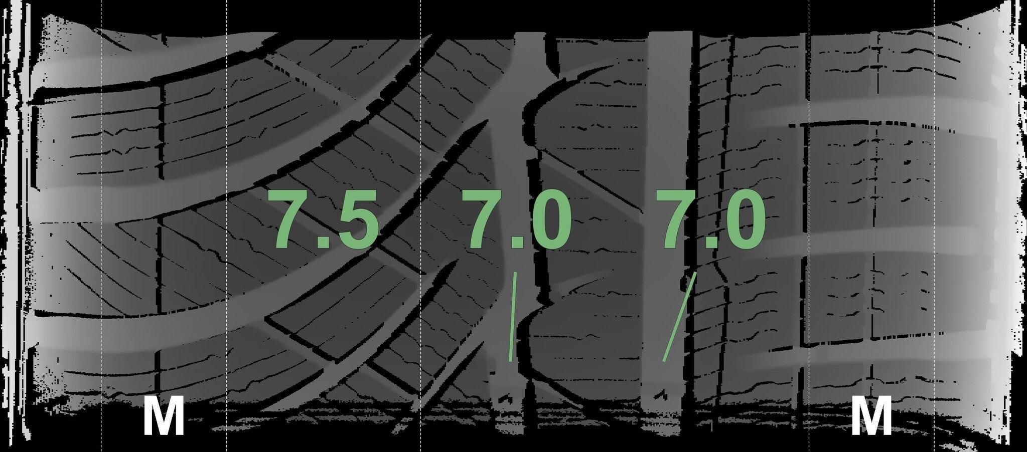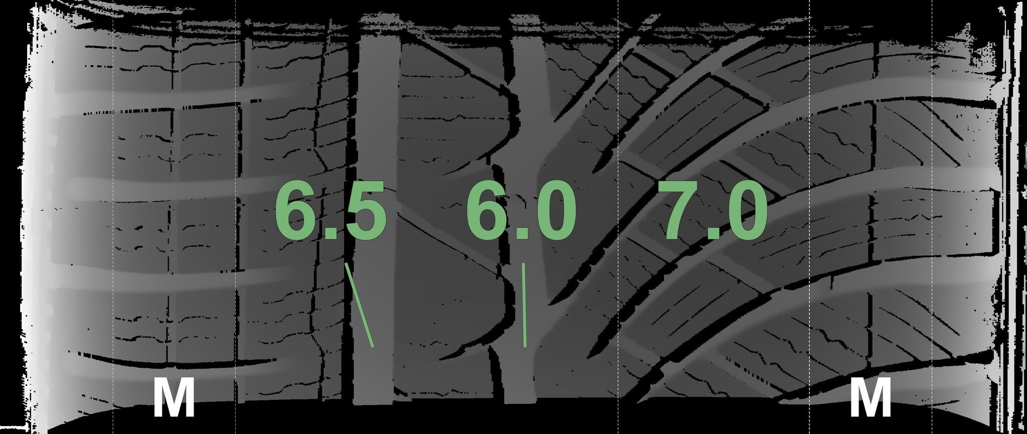 Die gemessenen Profiltiefen und die Details der Felgen sind oben dargestellt.