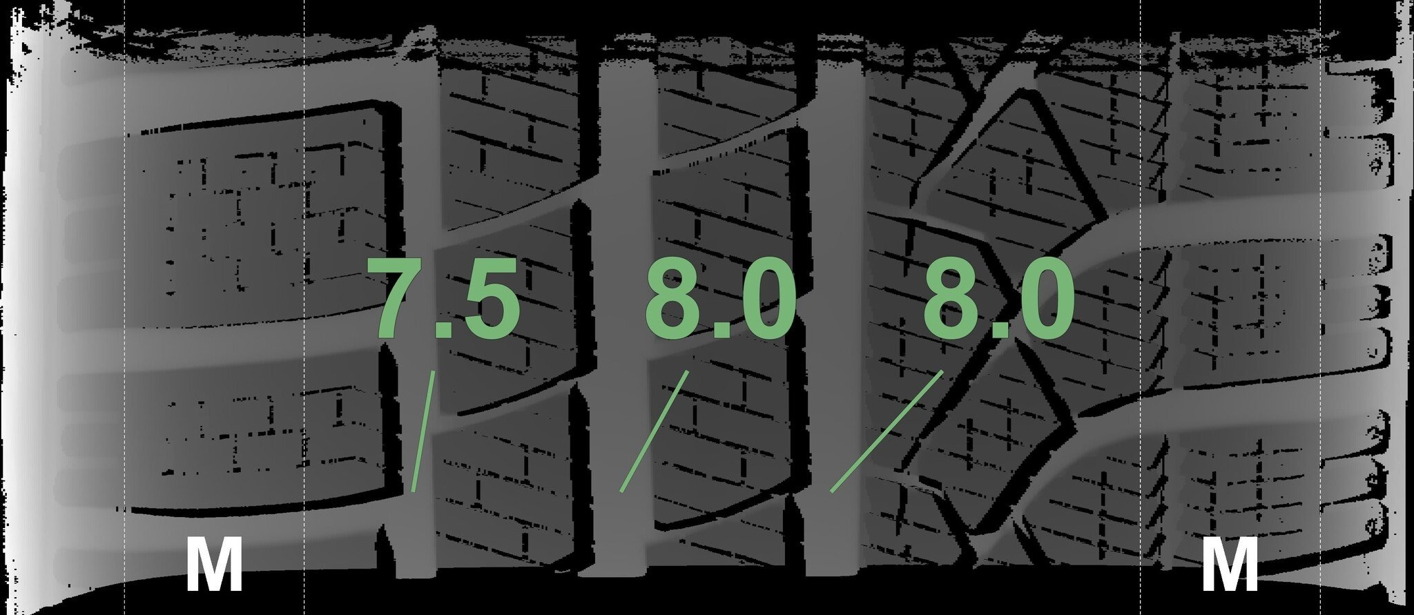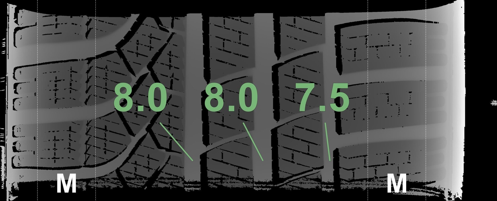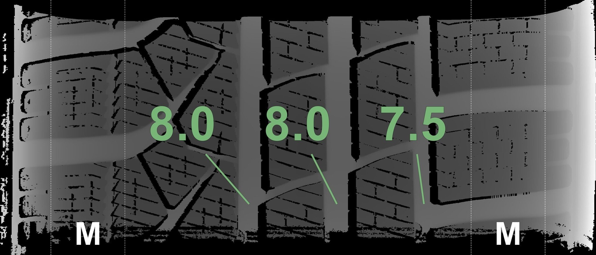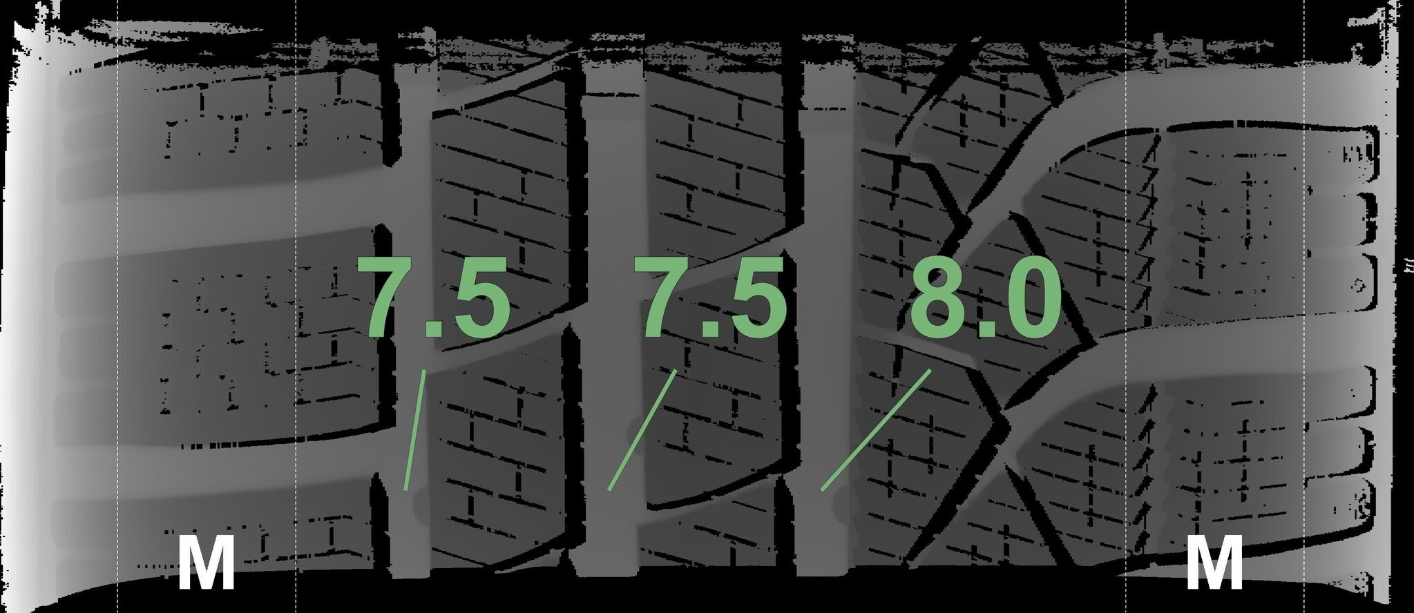 Die gemessenen Profiltiefen und die Details der Felgen sind oben dargestellt.