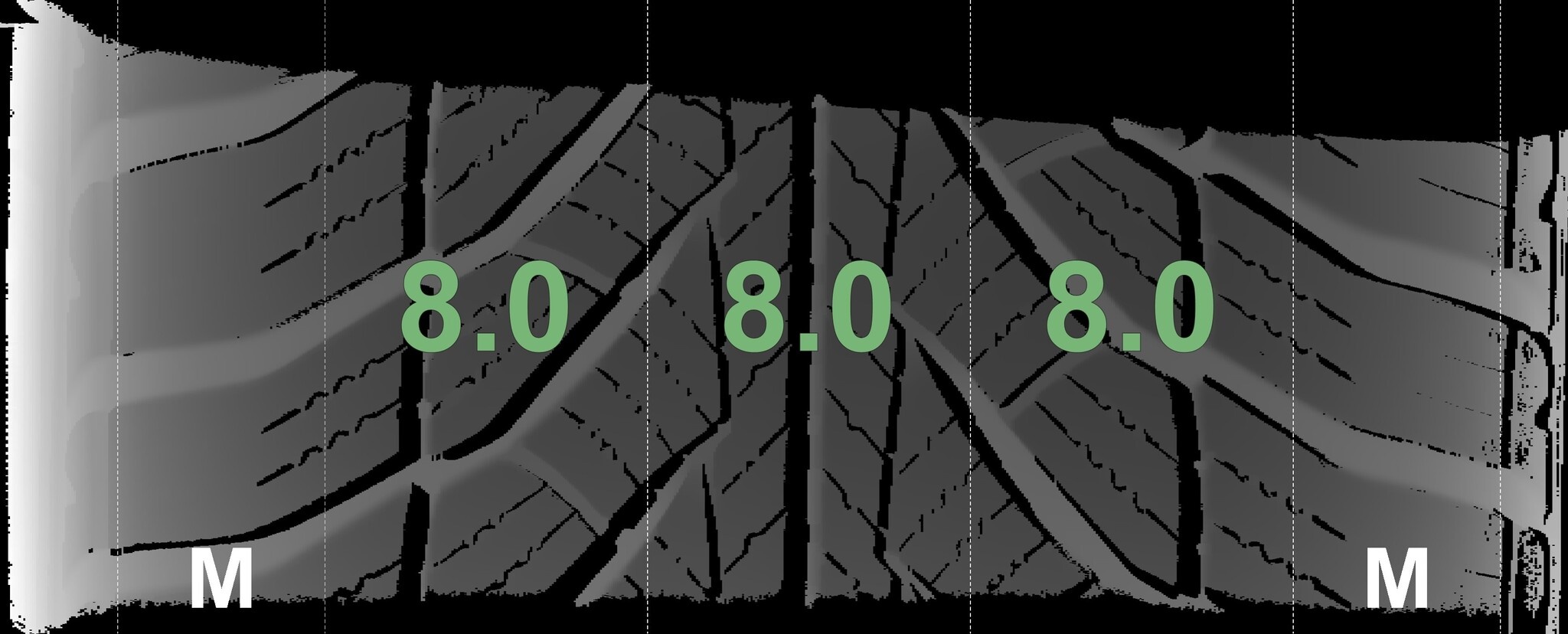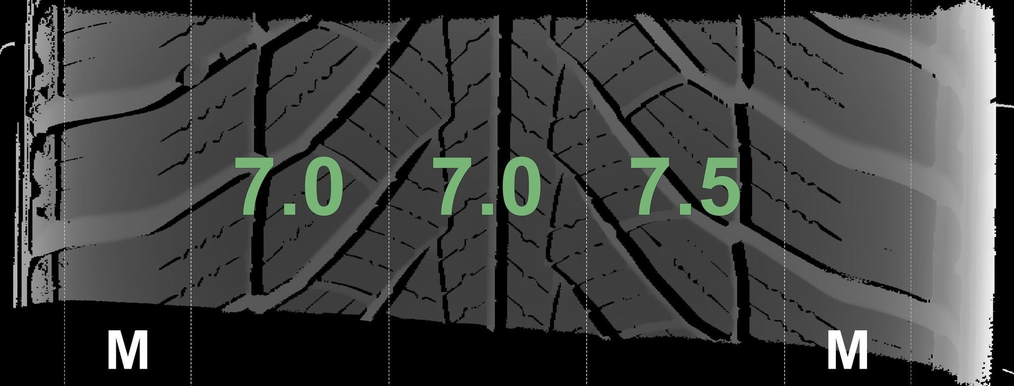 Die gemessenen Profiltiefen und die Details der Felgen sind oben dargestellt.