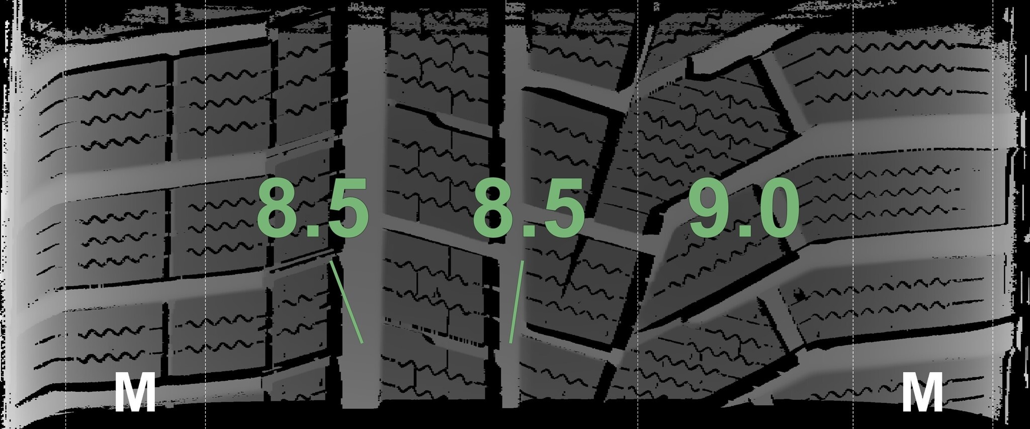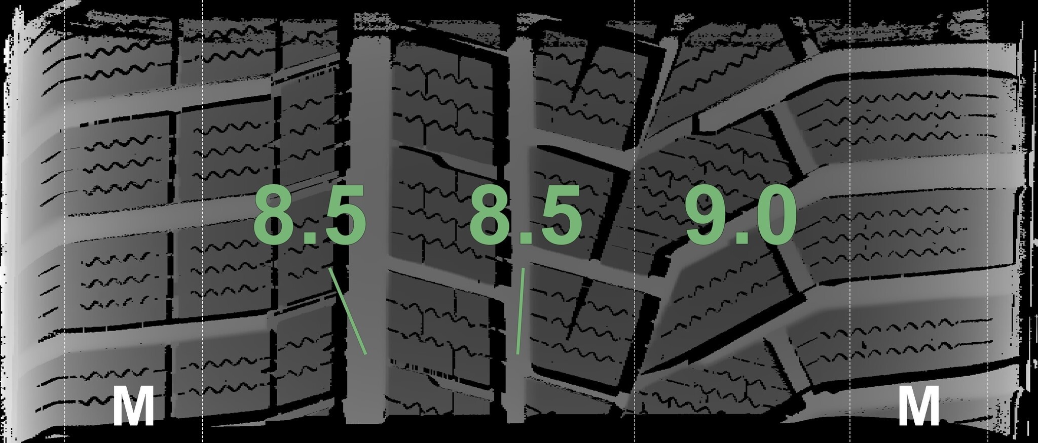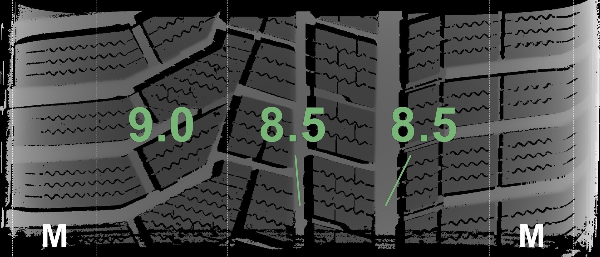 Die gemessenen Profiltiefen und die Details der Felgen sind oben angegeben.