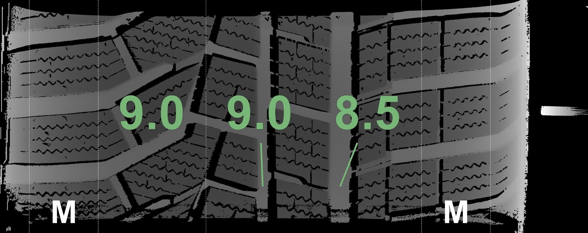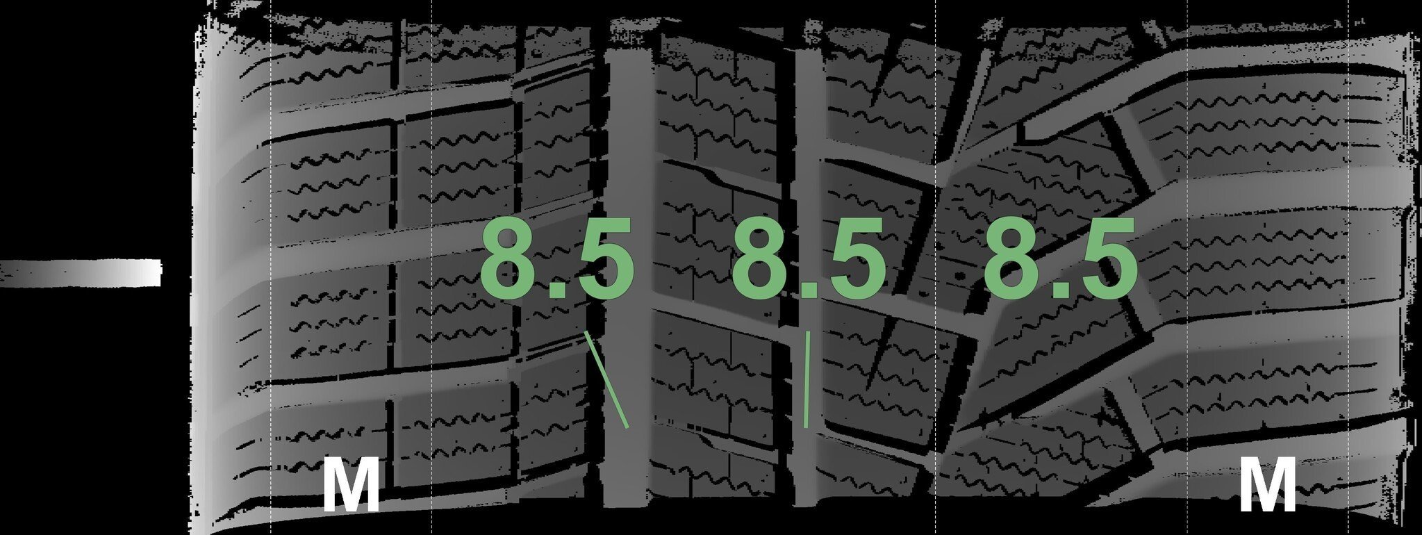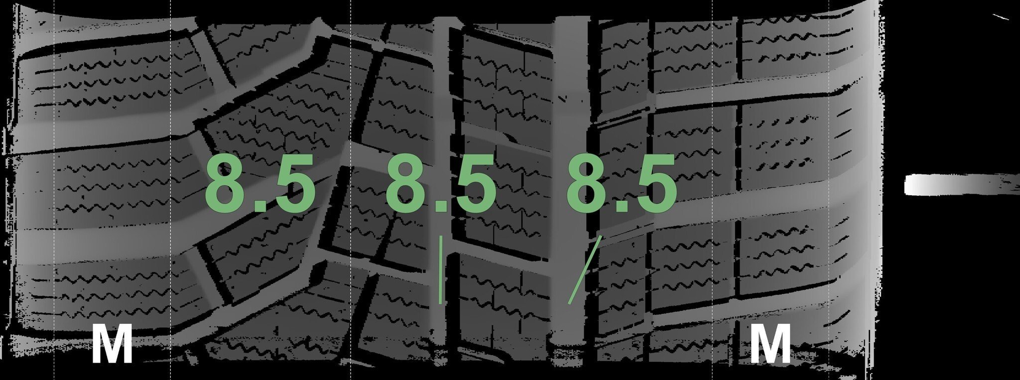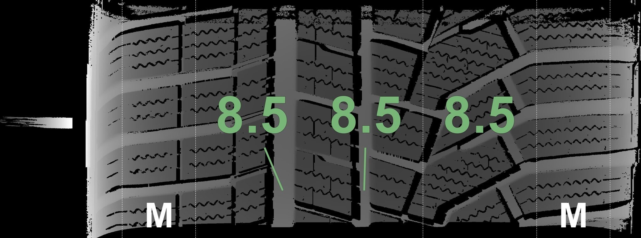| Zustand | Profiltiefe | DOT | Vorderachse Links | Neu | 8.5 mm | 4924 |