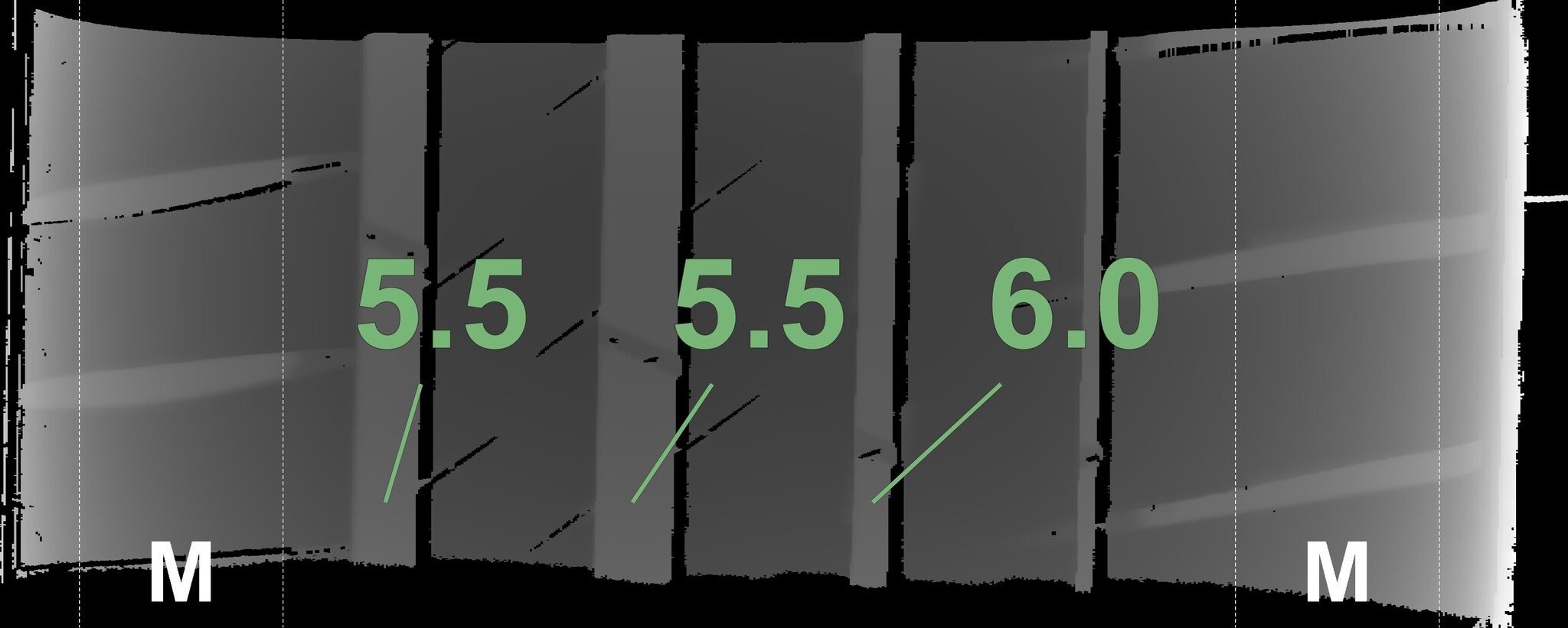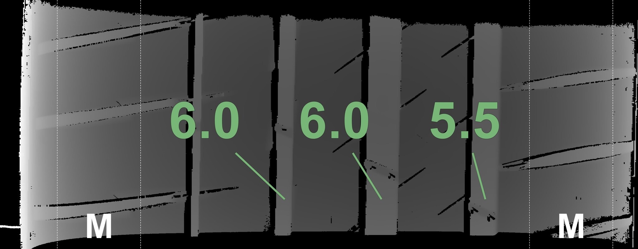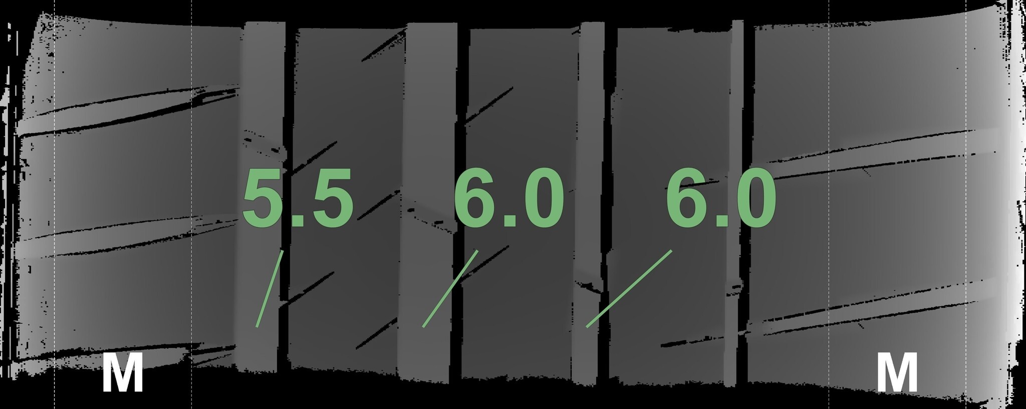 Die gemessenen Profiltiefen und die Details der Felgen sind oben dargestellt.