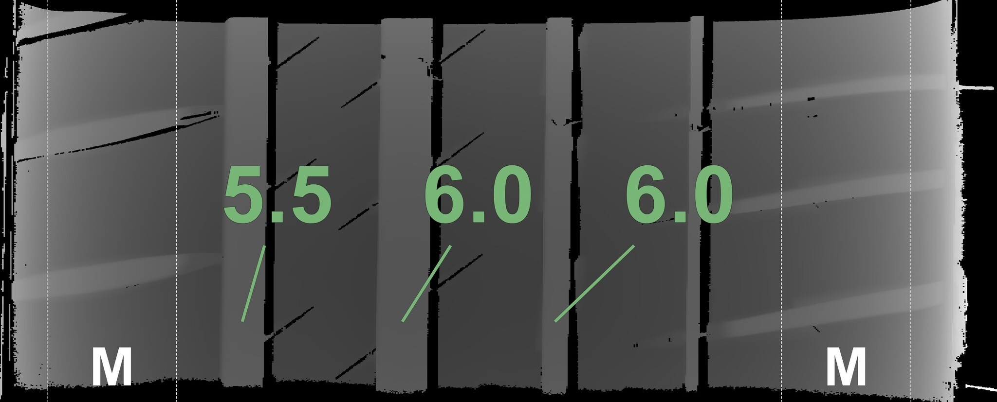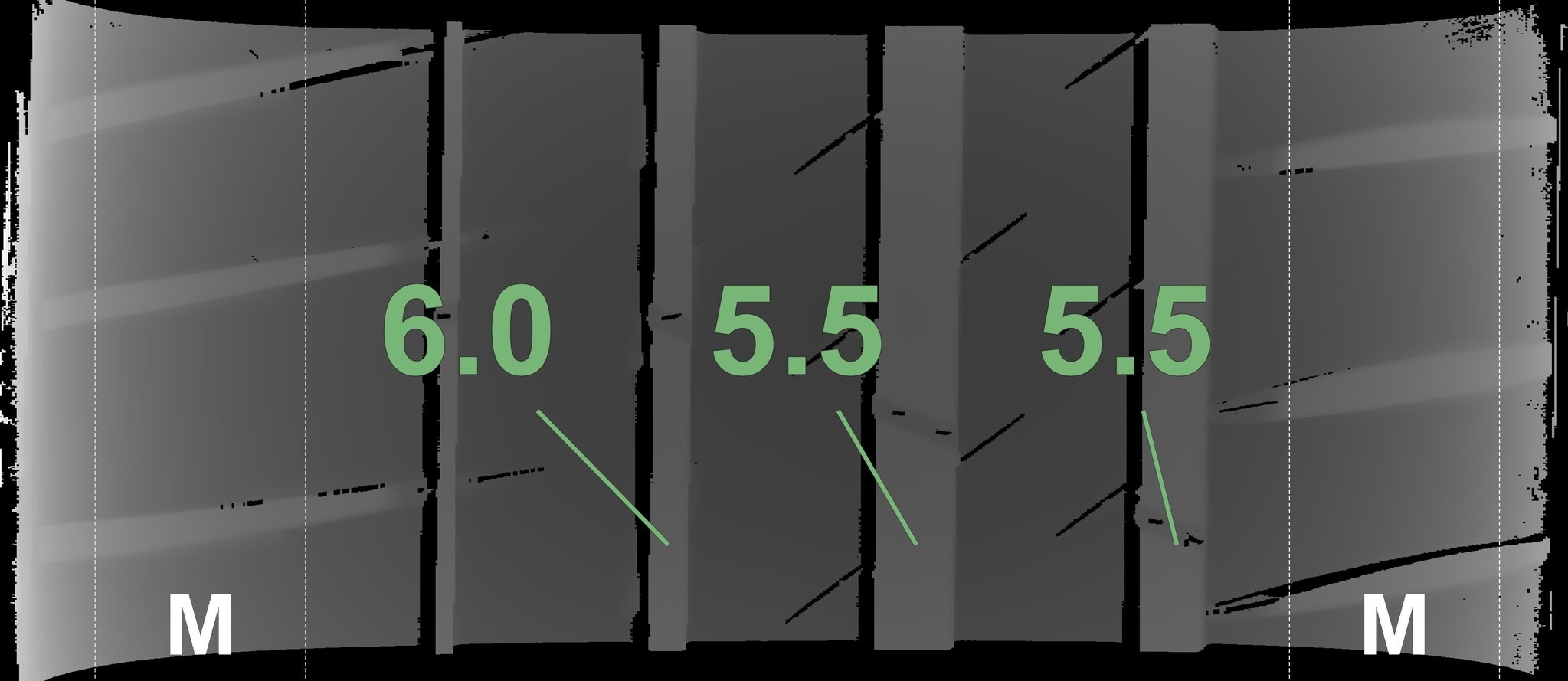 Die gemessenen Profiltiefen und die Details der Felgen sind oben dargestellt.