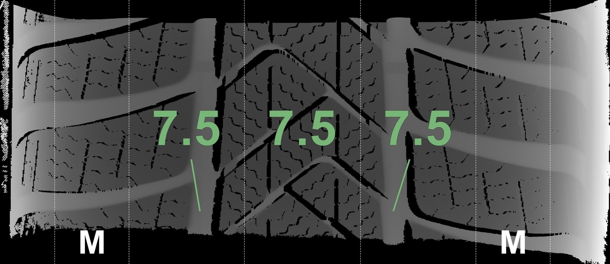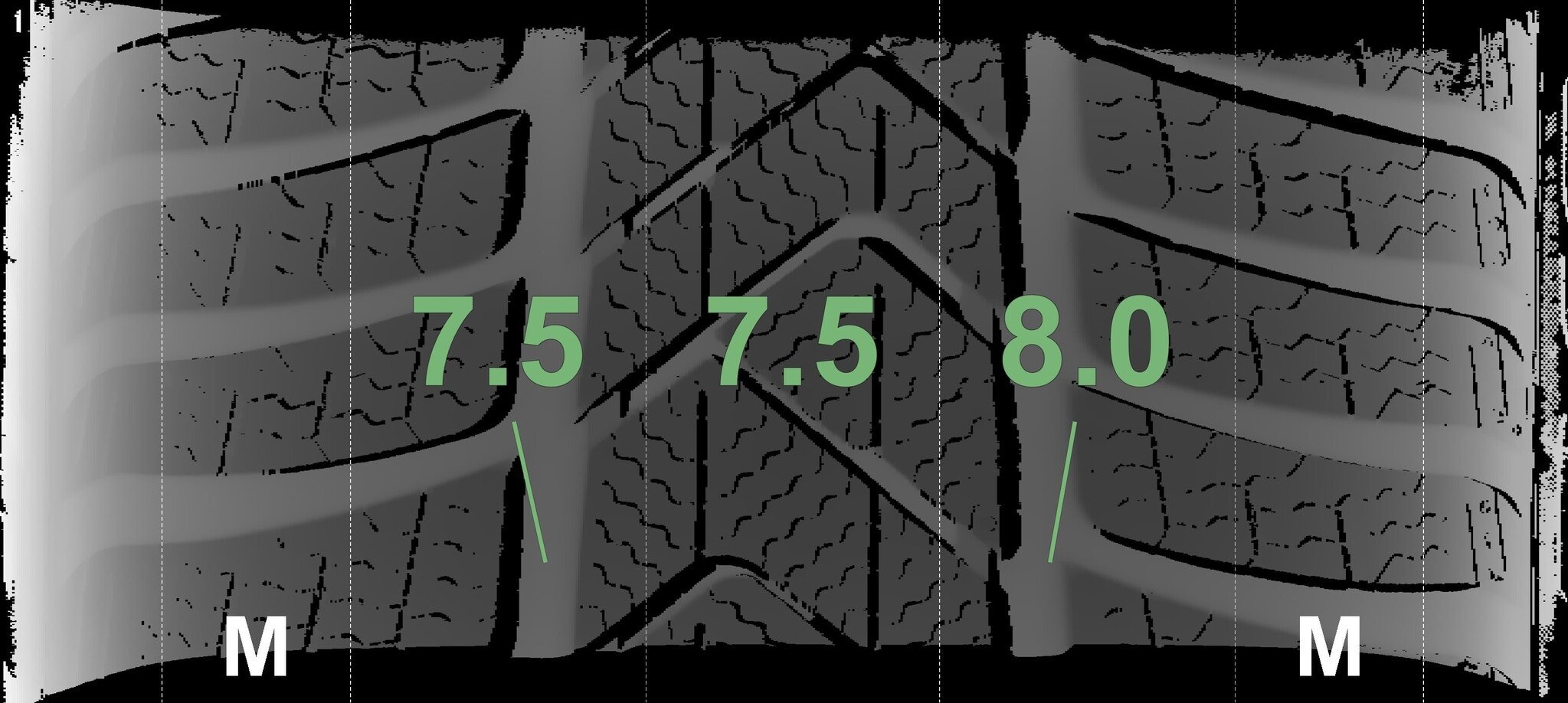 | Zustand | Profiltiefe | DOT | Hinterachse Rechts | Neu | 7.5 mm | 2622 |
