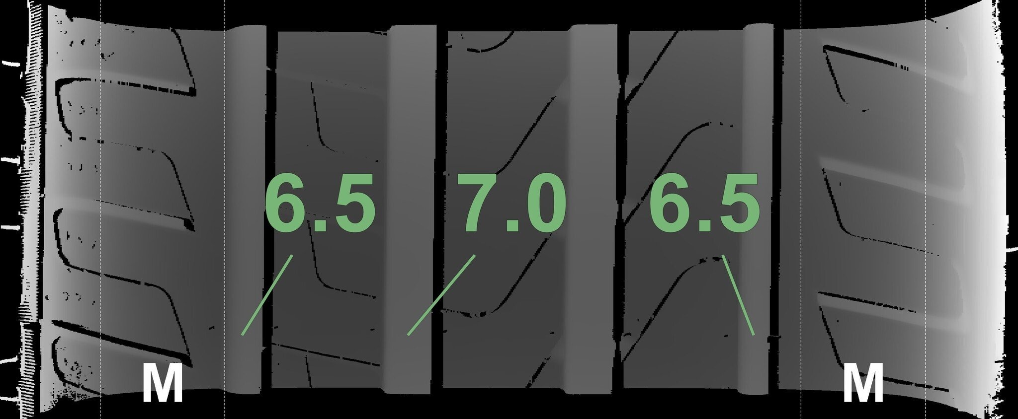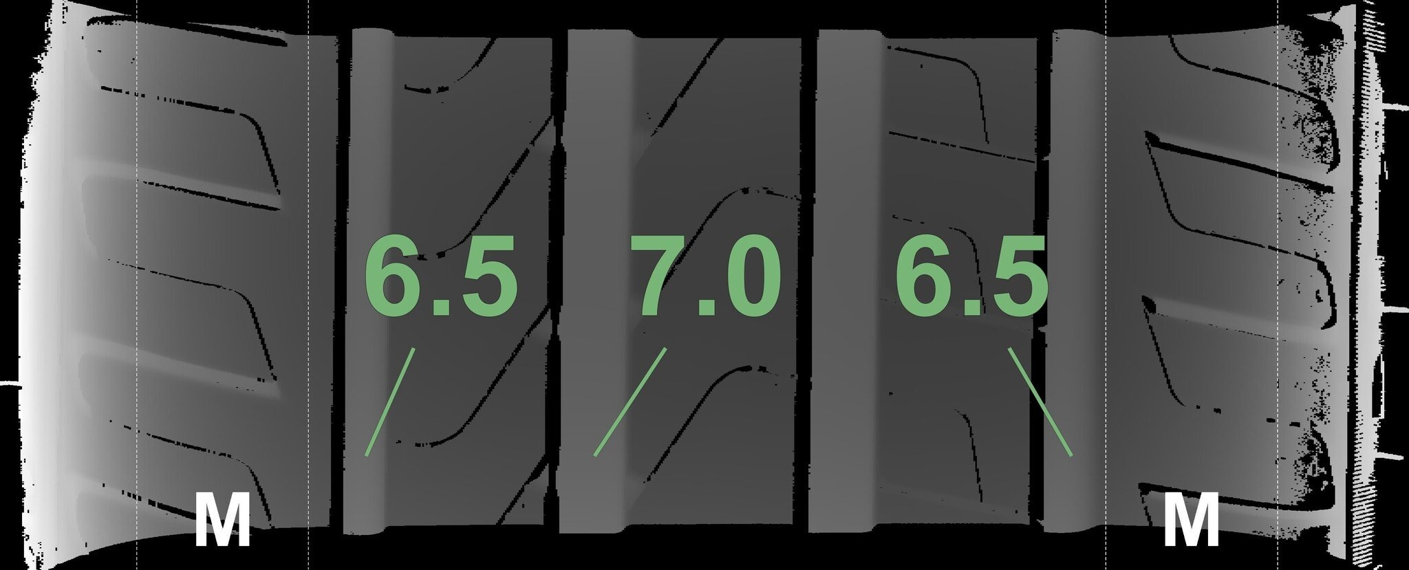 Die gemessenen Profiltiefen und die Details der Felgen sind oben dargestellt.