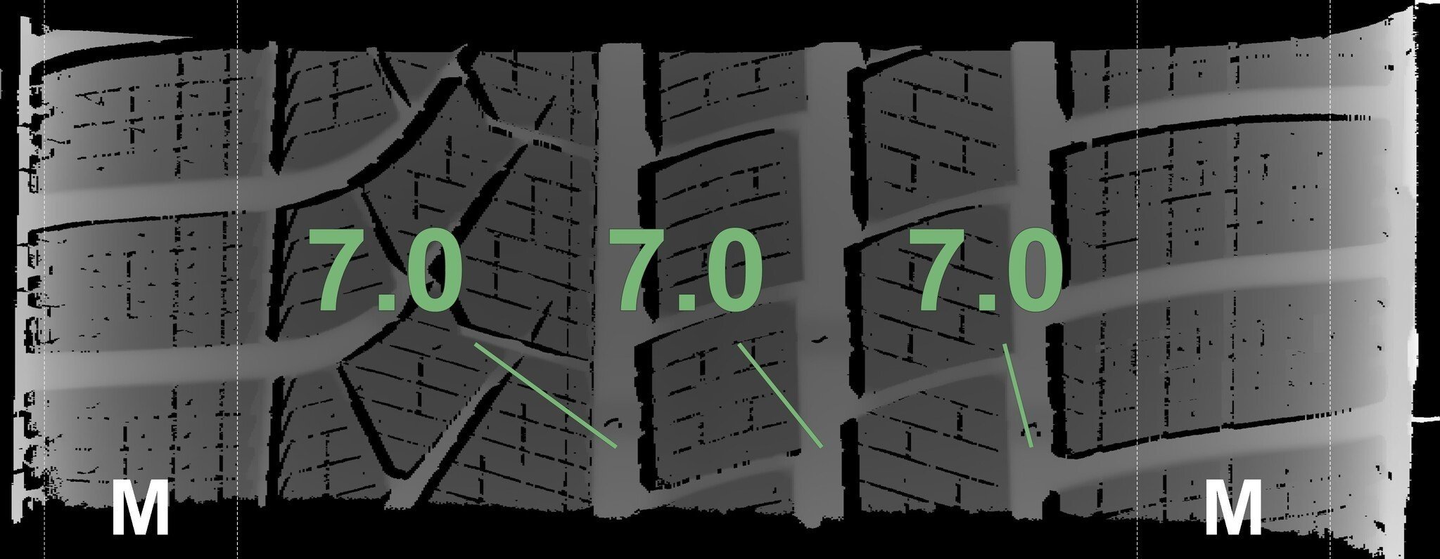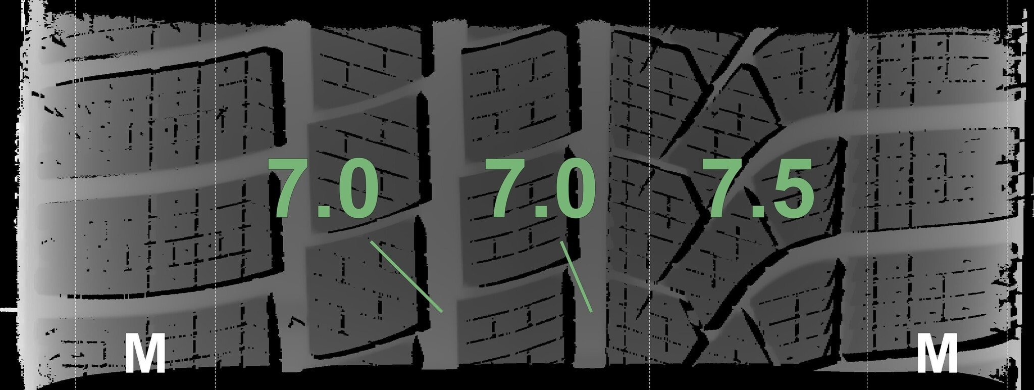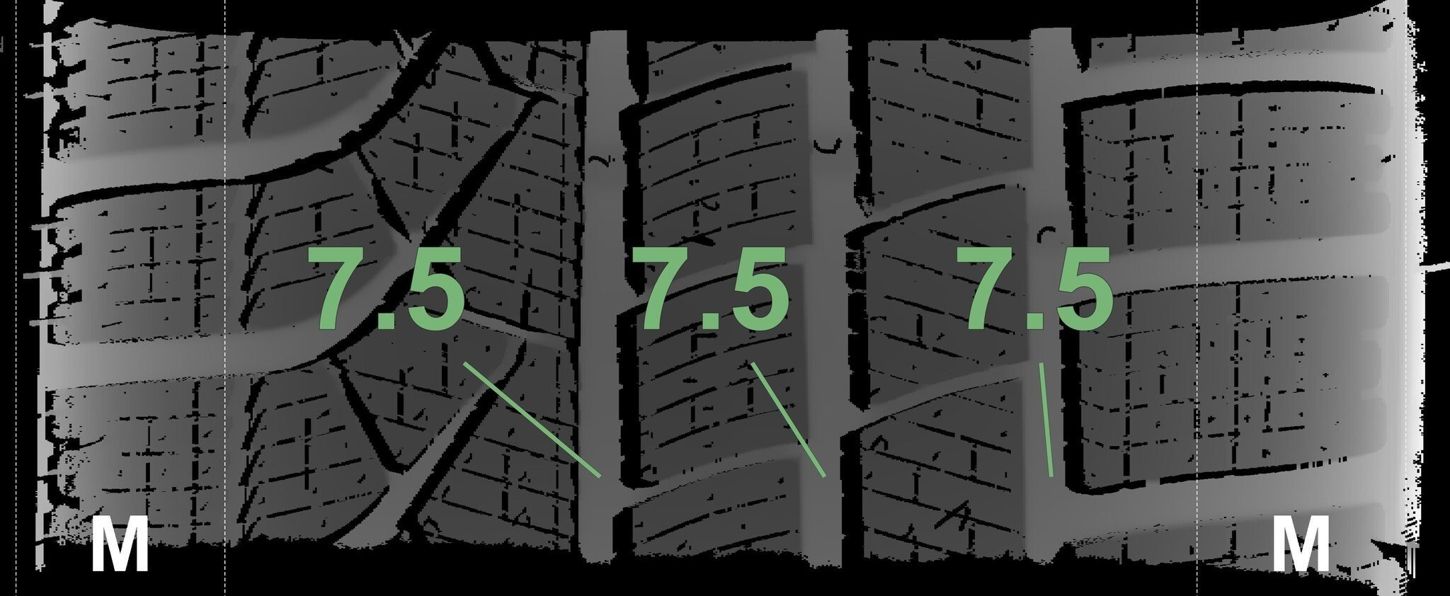 | Zustand | Profiltiefe | DOT | Vorderachse Links | Neu | 7.5 mm | 4925 |