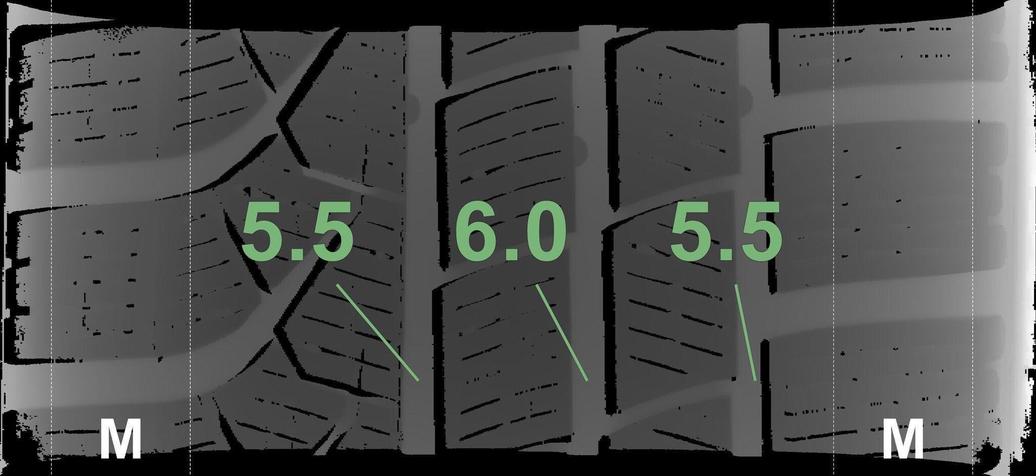 Die gemessenen Profiltiefen und die Details der Felgen sind oben dargestellt.