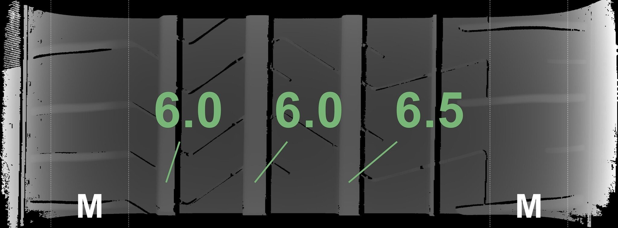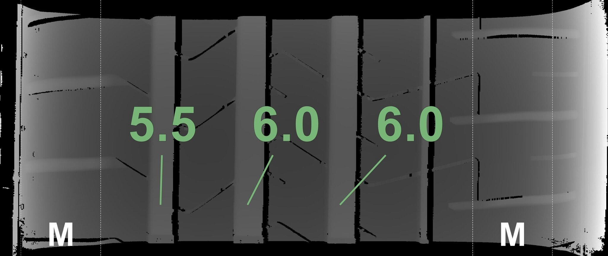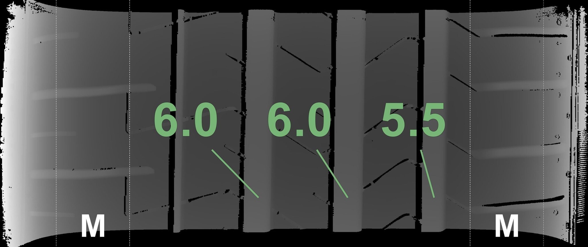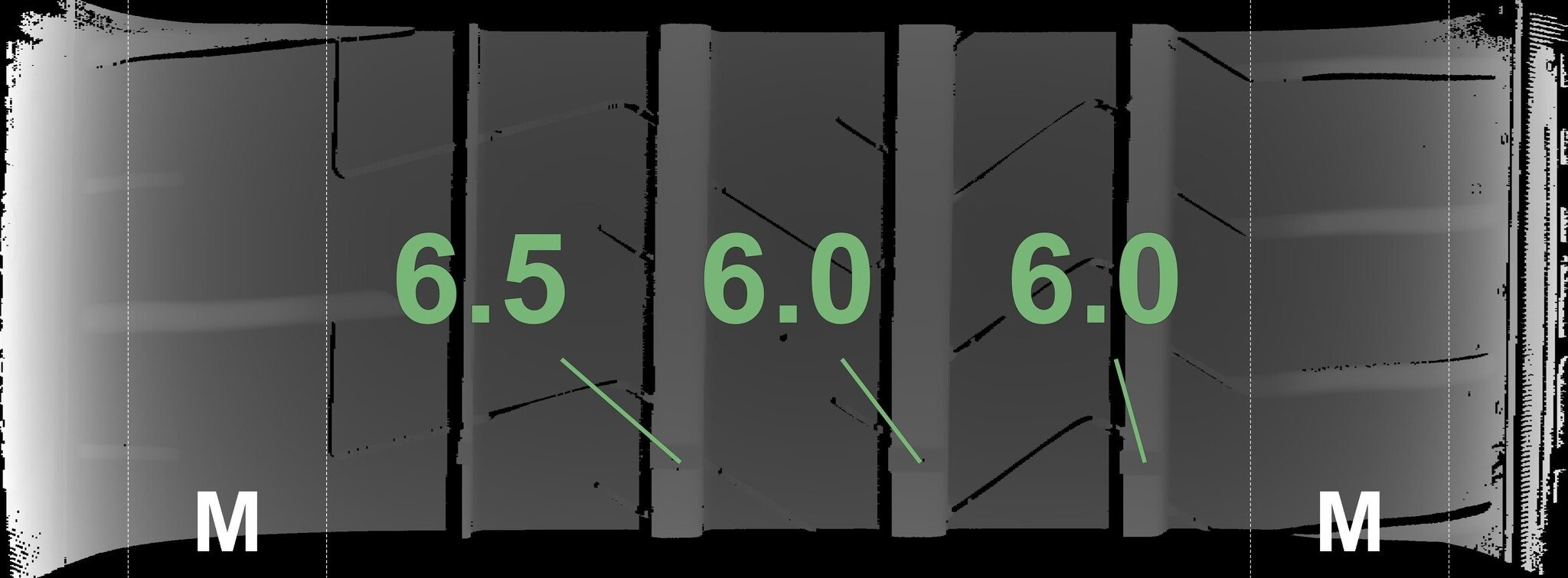 Die gemessenen Profiltiefen und die Details der Felgen sind oben dargestellt.