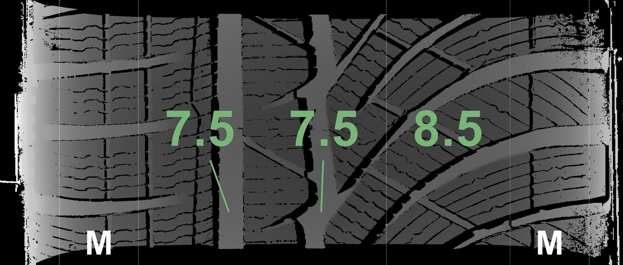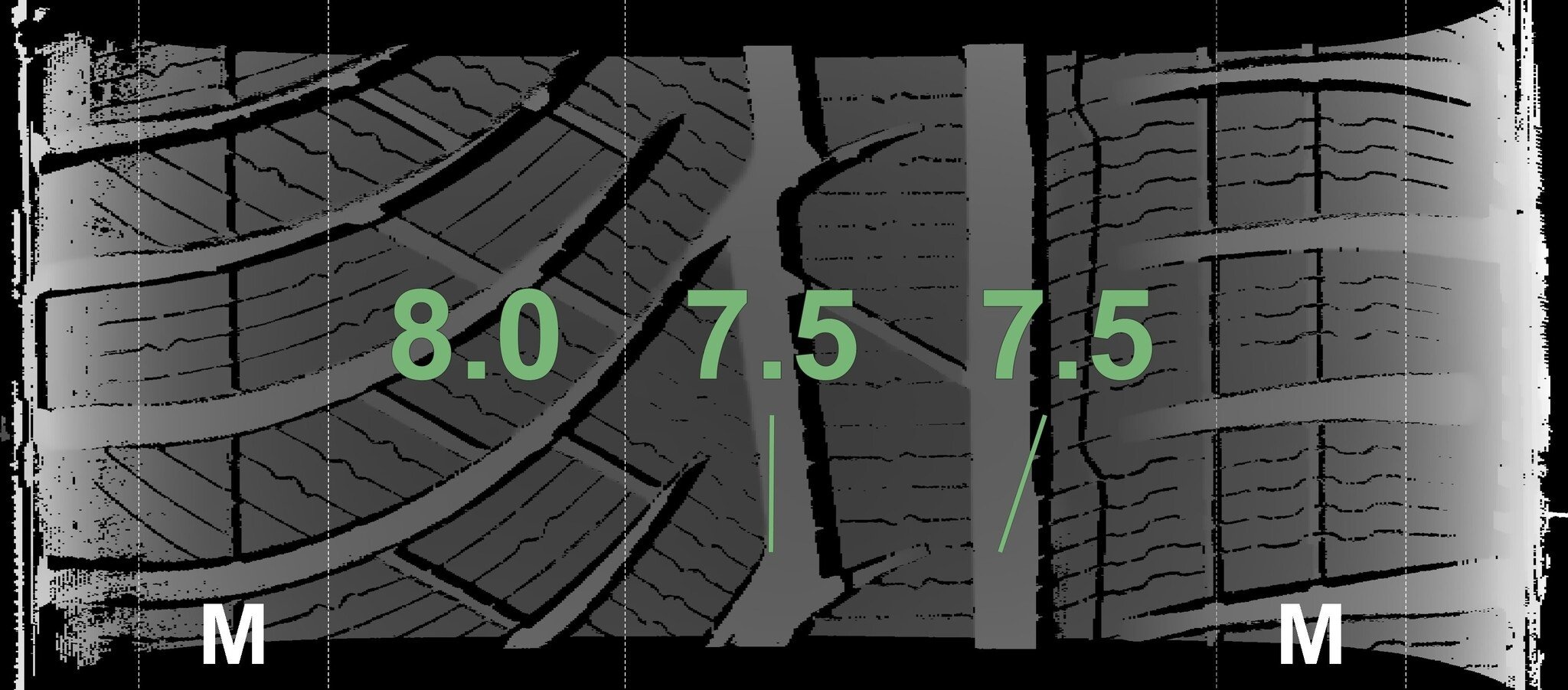 | Zustand | Profiltiefe | DOT | Hinterachse Links | Neu | 7,5 mm | 2720 |