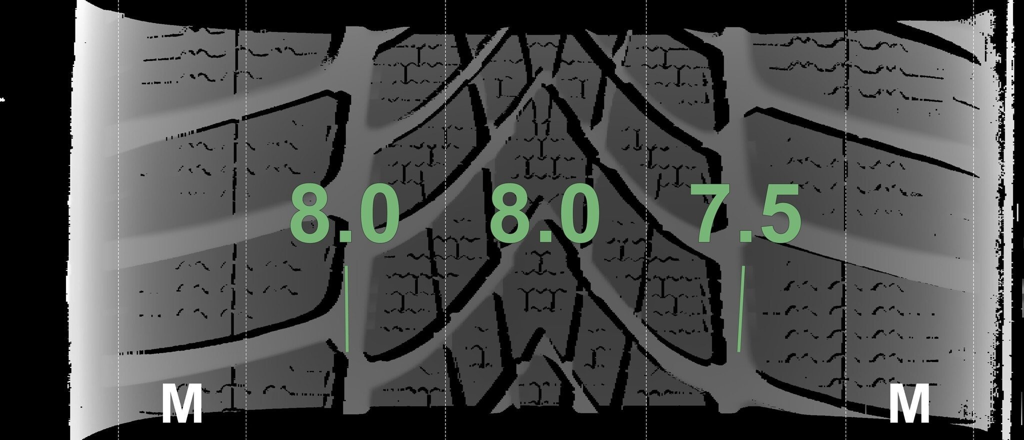 Zustand | Profiltiefe | DOT | Vorderachse Links | Neu | 7,5 mm | 4916 |