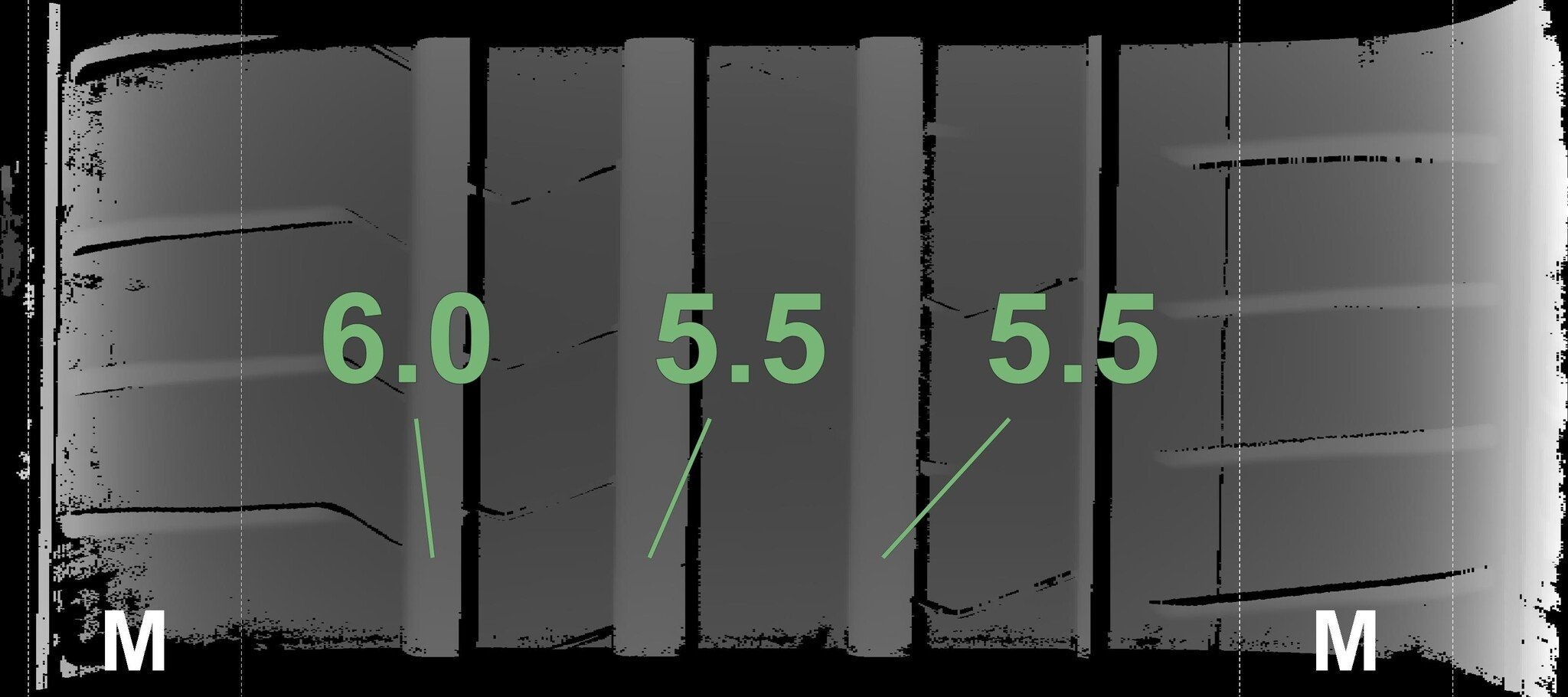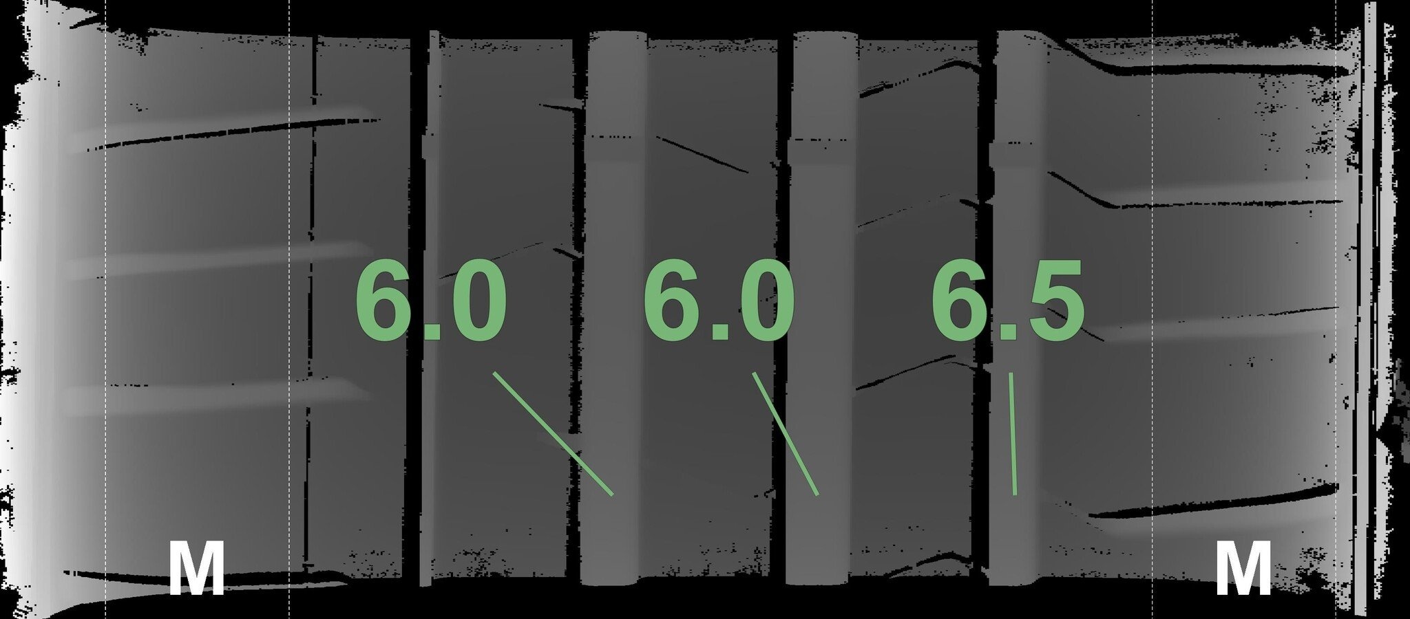 | Zustand | Profiltiefe | DOT | Vorderachse Links | Gebraucht | 6,0 mm | 2120 |