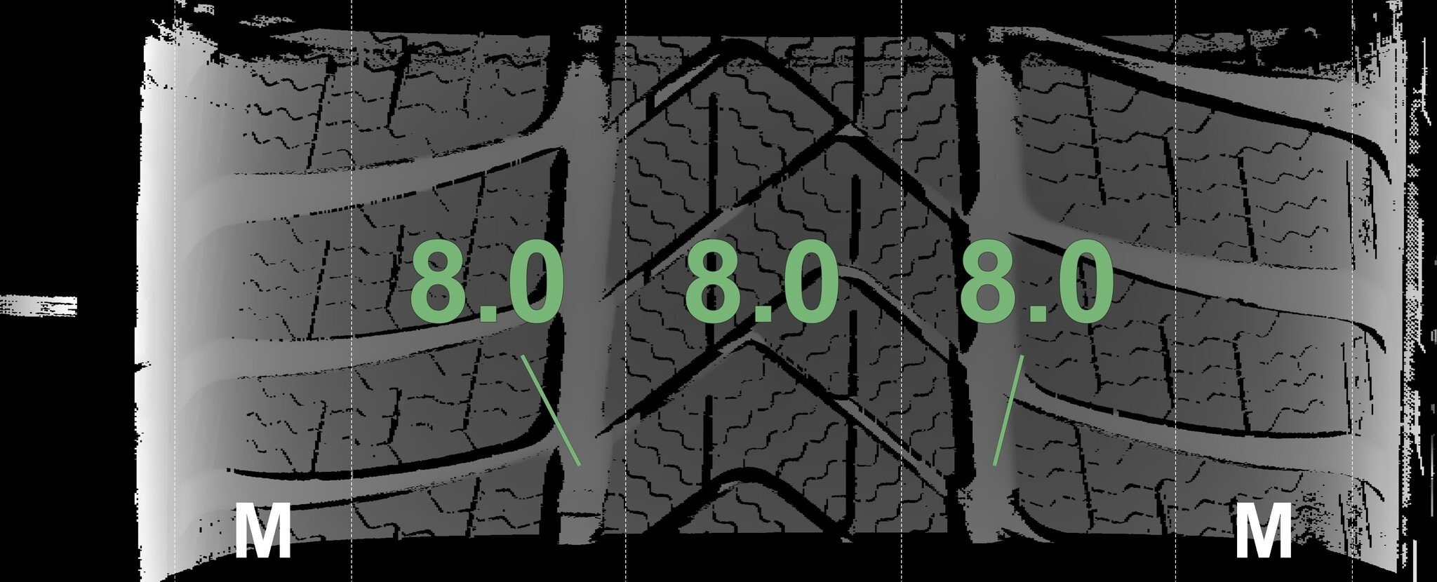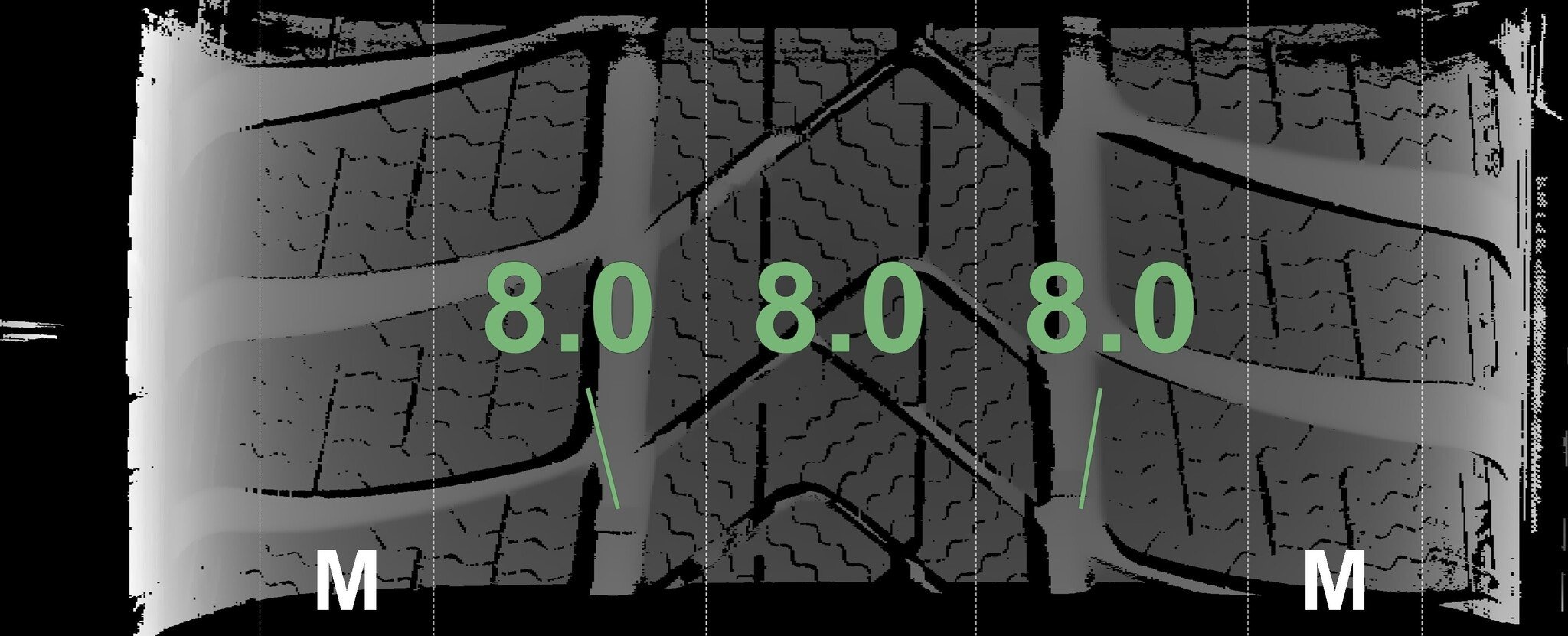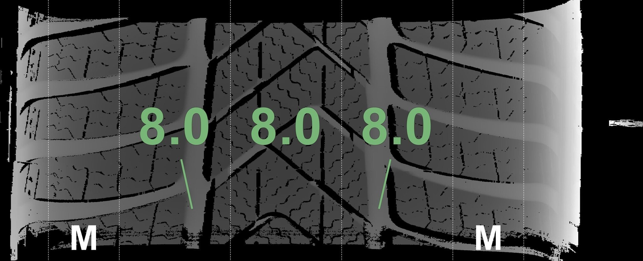 | Zustand | Profiltiefe | DOT | Vorderachse Links | Neu | 8,0 mm | 4023 |