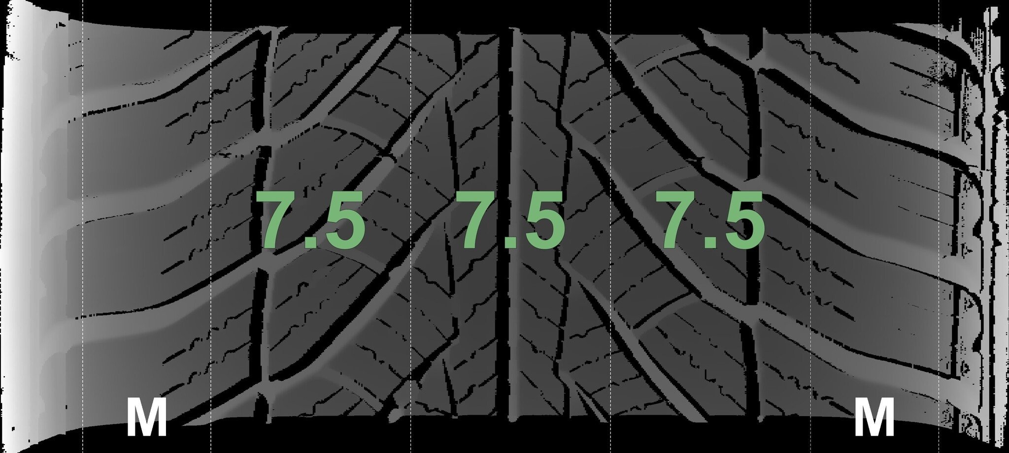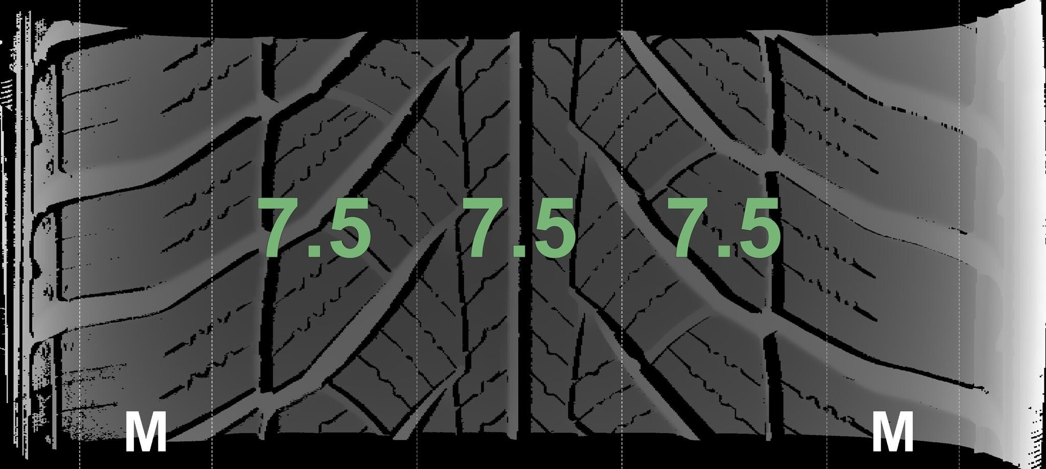| Zustand | Profiltiefe | DOT | Hinterachse Rechts | Gebraucht | 7,5 mm | 3821 |