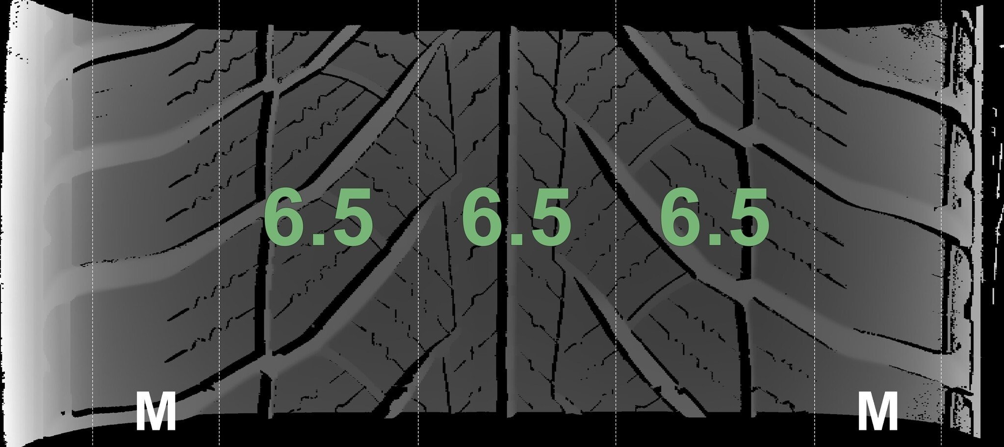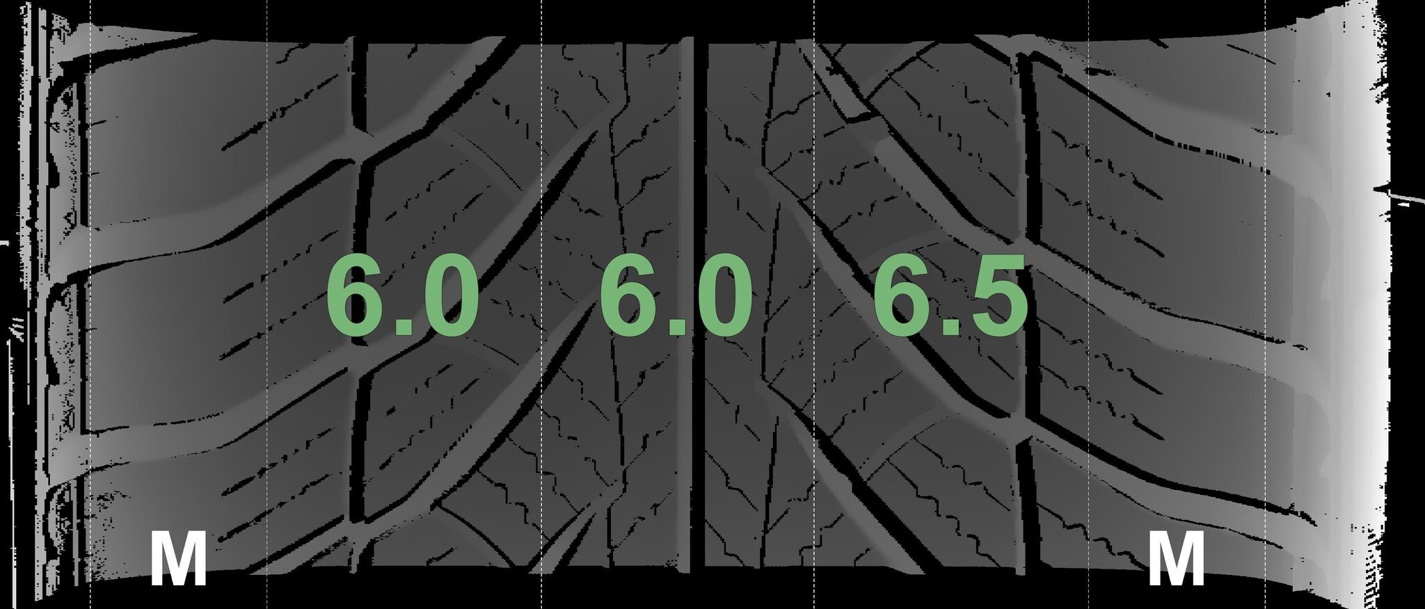 | Zustand | Profiltiefe | DOT | Vorderachse Links | Gebraucht | 6,5 mm | 3821 |