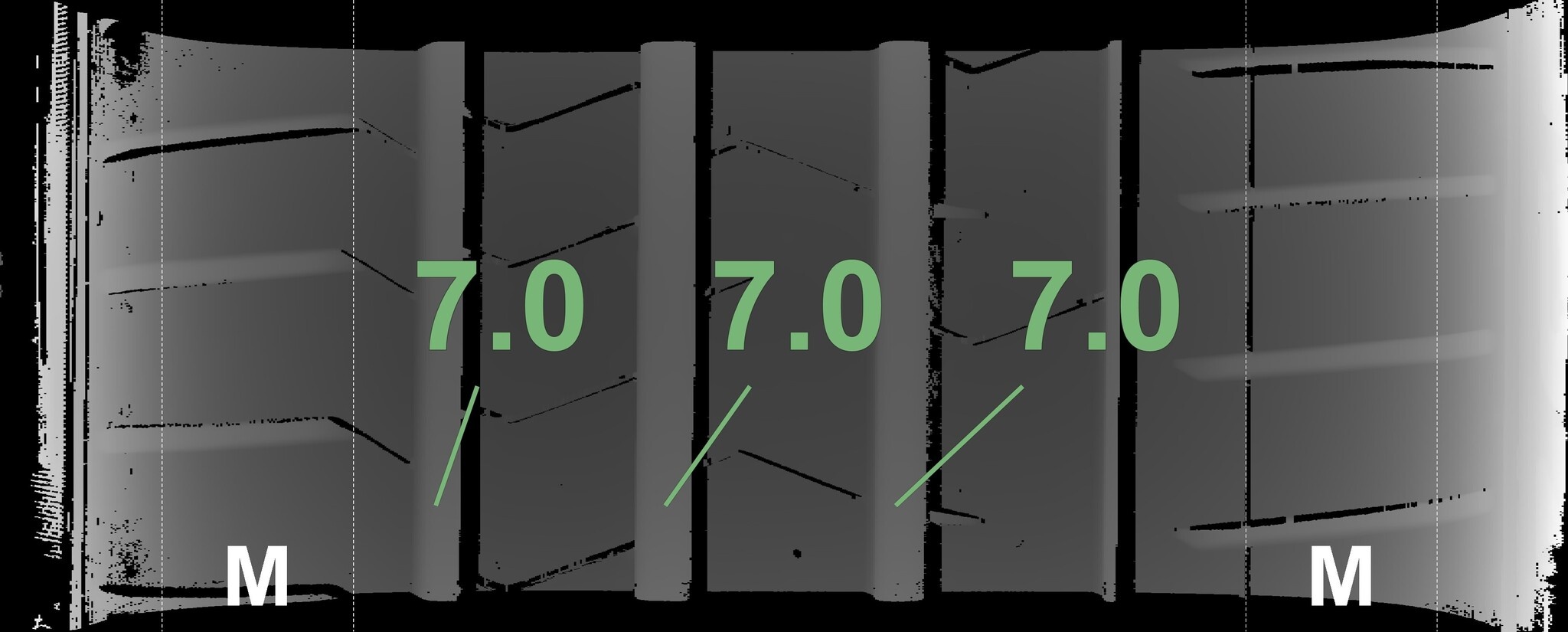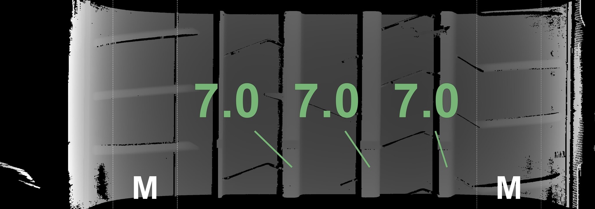| Zustand | Profiltiefe | DOT | Hinterachse Rechts | Neu | 7,0 mm | 0925 |