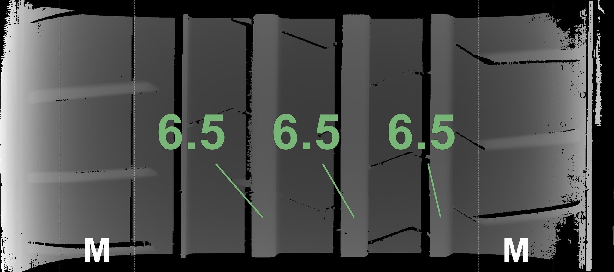 | Zustand | Profiltiefe | DOT | Vorderachse Rechts | Gebraucht | 6,5 mm | 3523 |