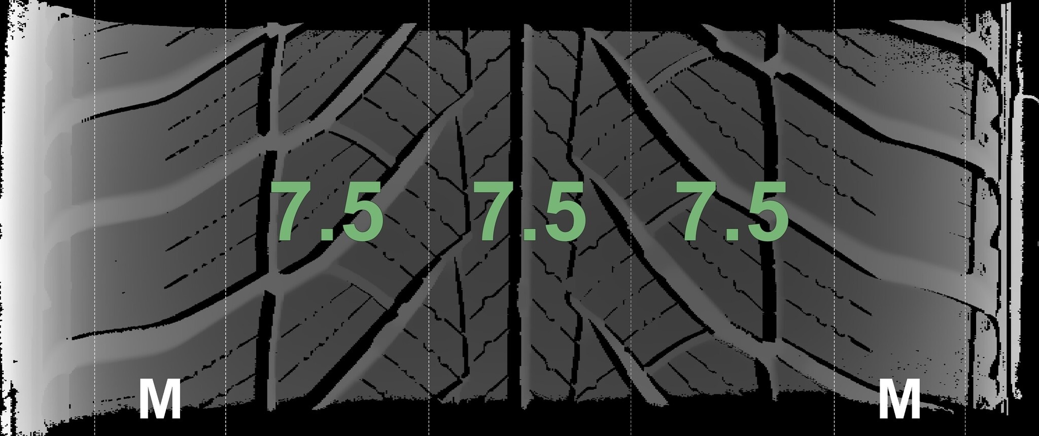 Zustand | Profiltiefe | DOT | Vorderachse Links | Gebraucht | 7,5 mm | 2623 |