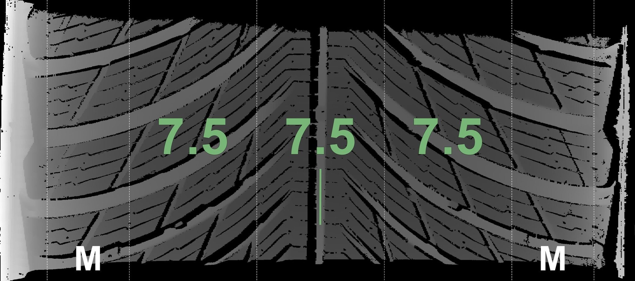 | Zustand | Profiltiefe | DOT | Vorderachse Rechts | Neu | 7,5 mm | 4123 |