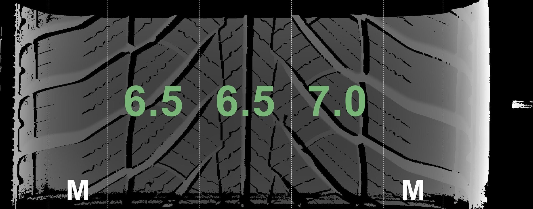 Die gemessenen Profiltiefen und die Details der Felgen sind oben angegeben.