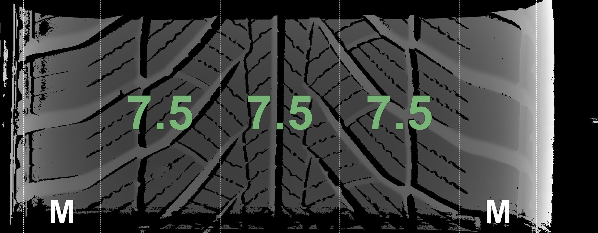 | Zustand | Profiltiefe | DOT | Hinterachse Rechts | Gebraucht | 7,5 mm | 4317 |