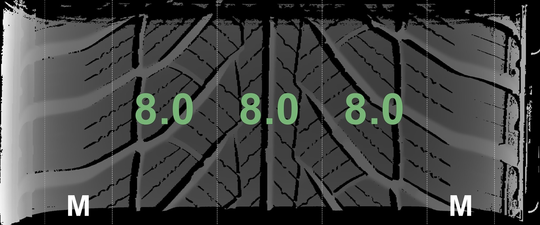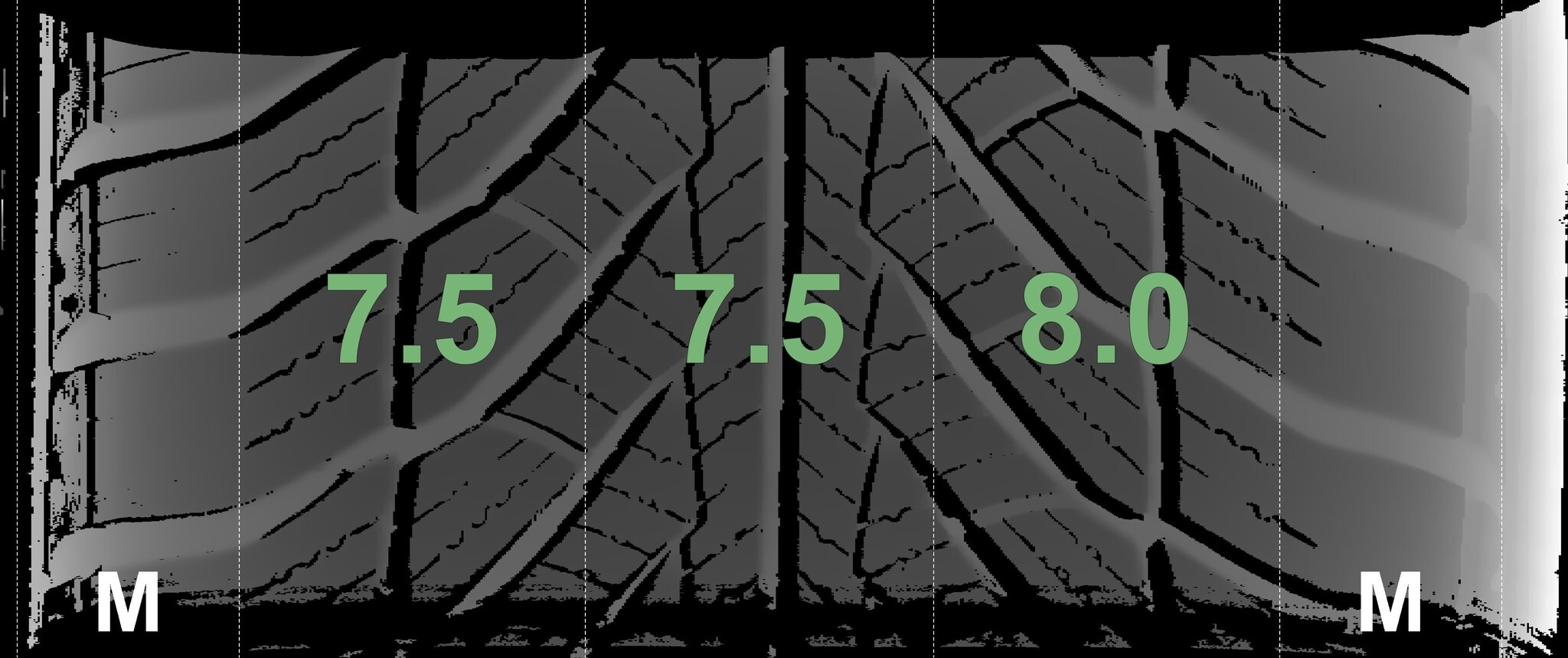 Die gemessenen Profiltiefen und die Details der Felgen sind oben angegeben.