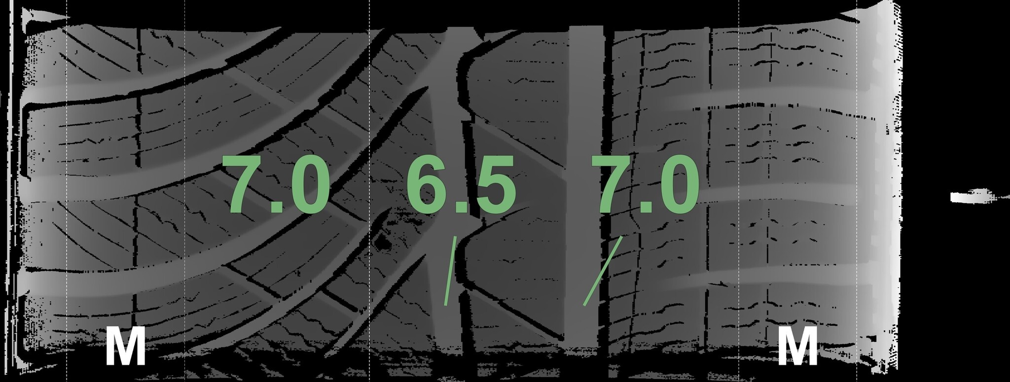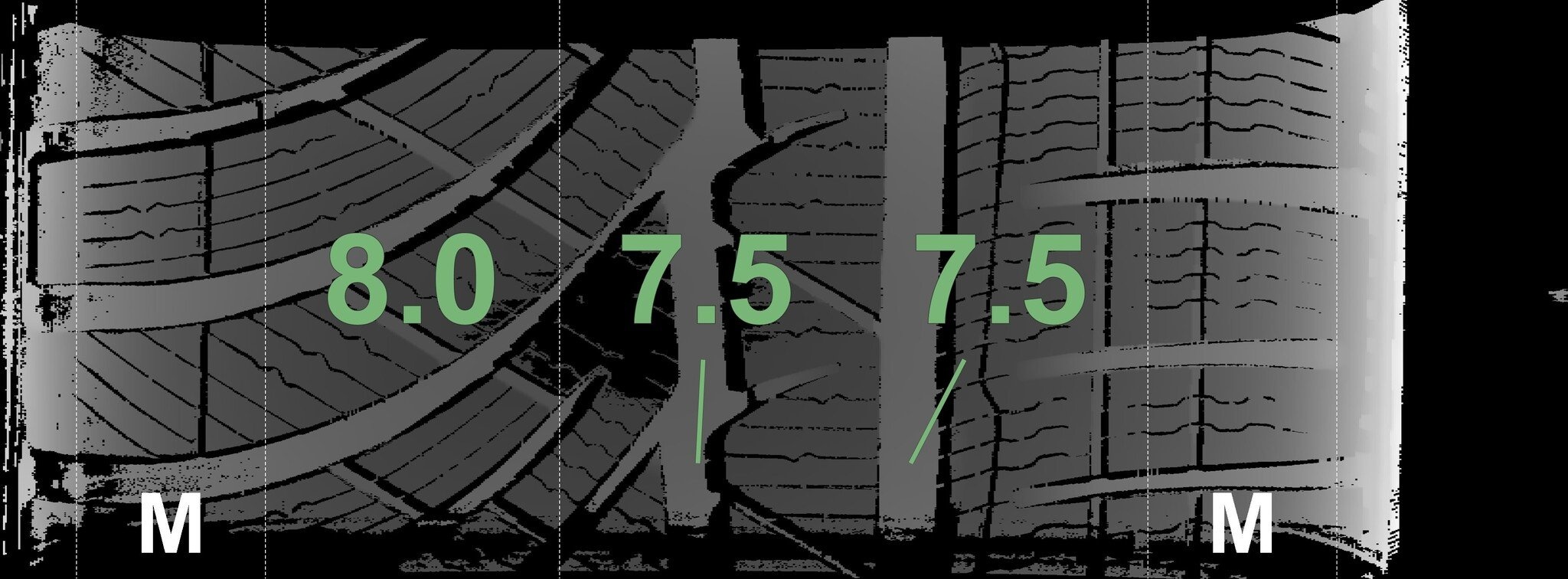 | Zustand | Profiltiefe | DOT | Hinterachse Rechts | Neu | 7,5 mm | 2425 |