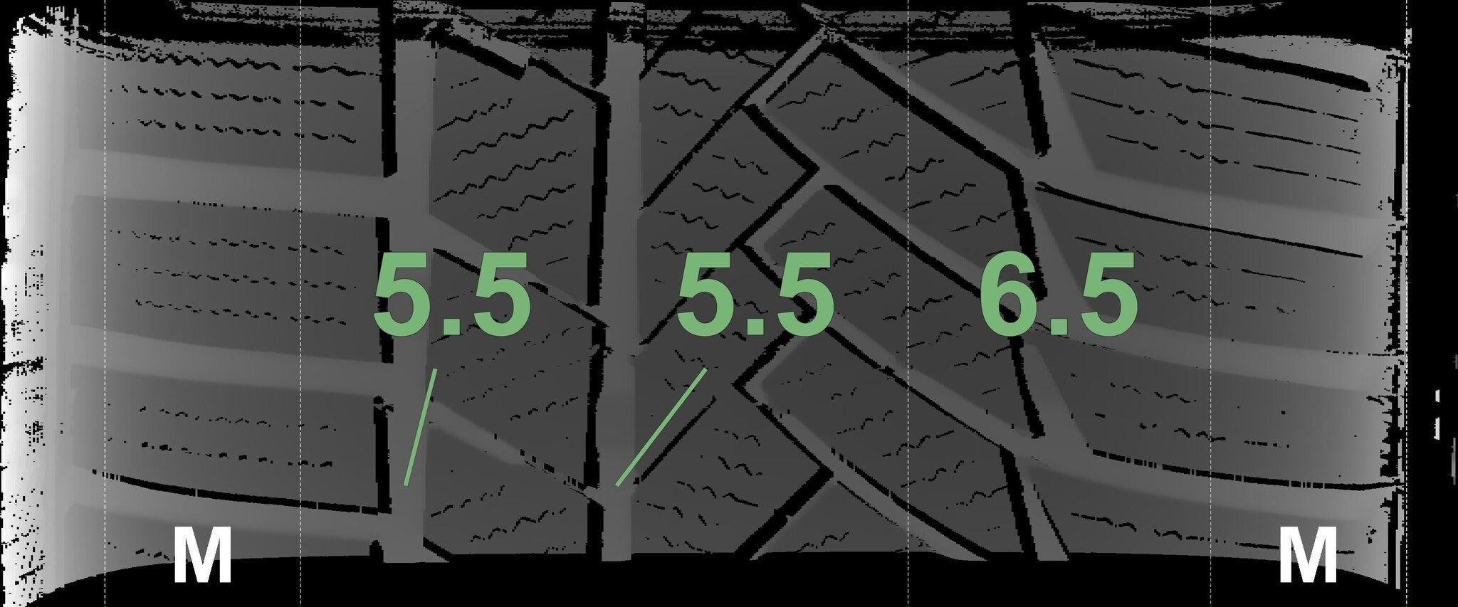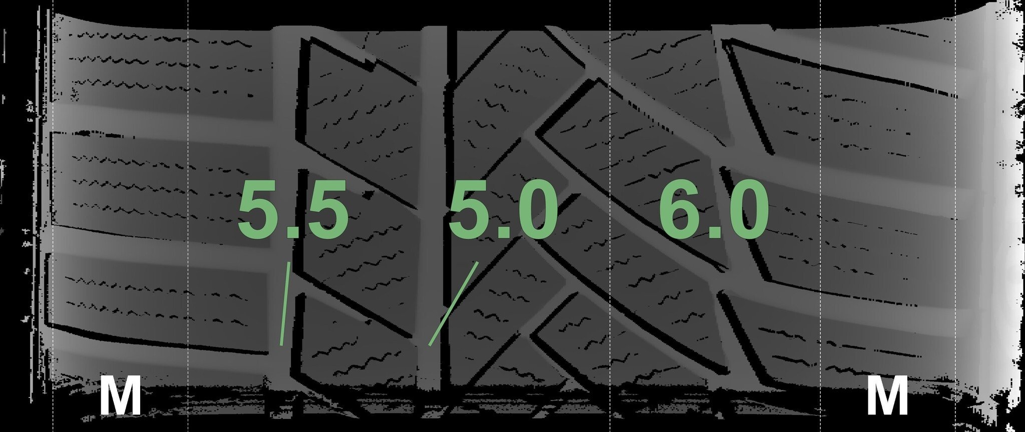 Die gemessenen Profiltiefen und die Details der Felgen sind oben angegeben.