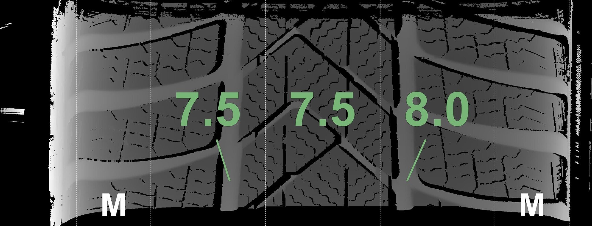 Die gemessenen Profiltiefen und die Details der Felgen sind oben dargestellt.