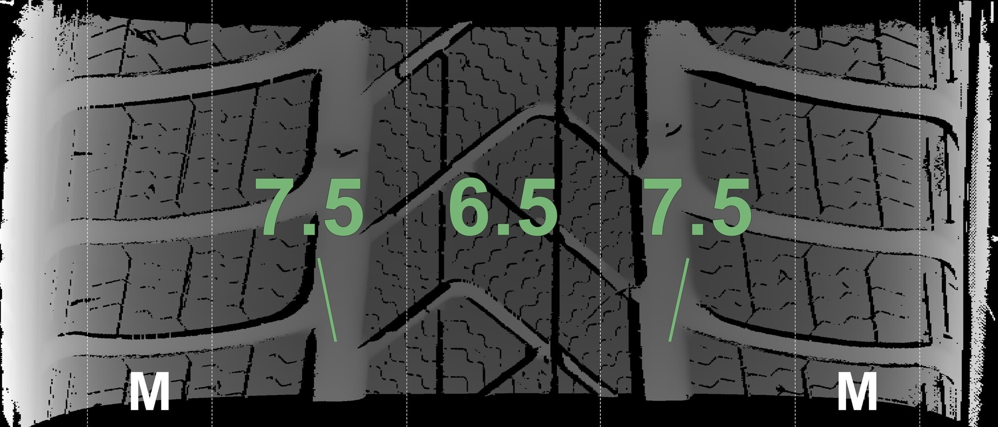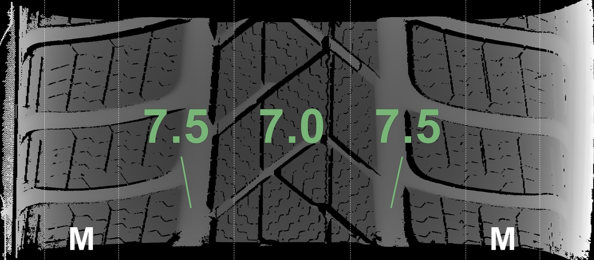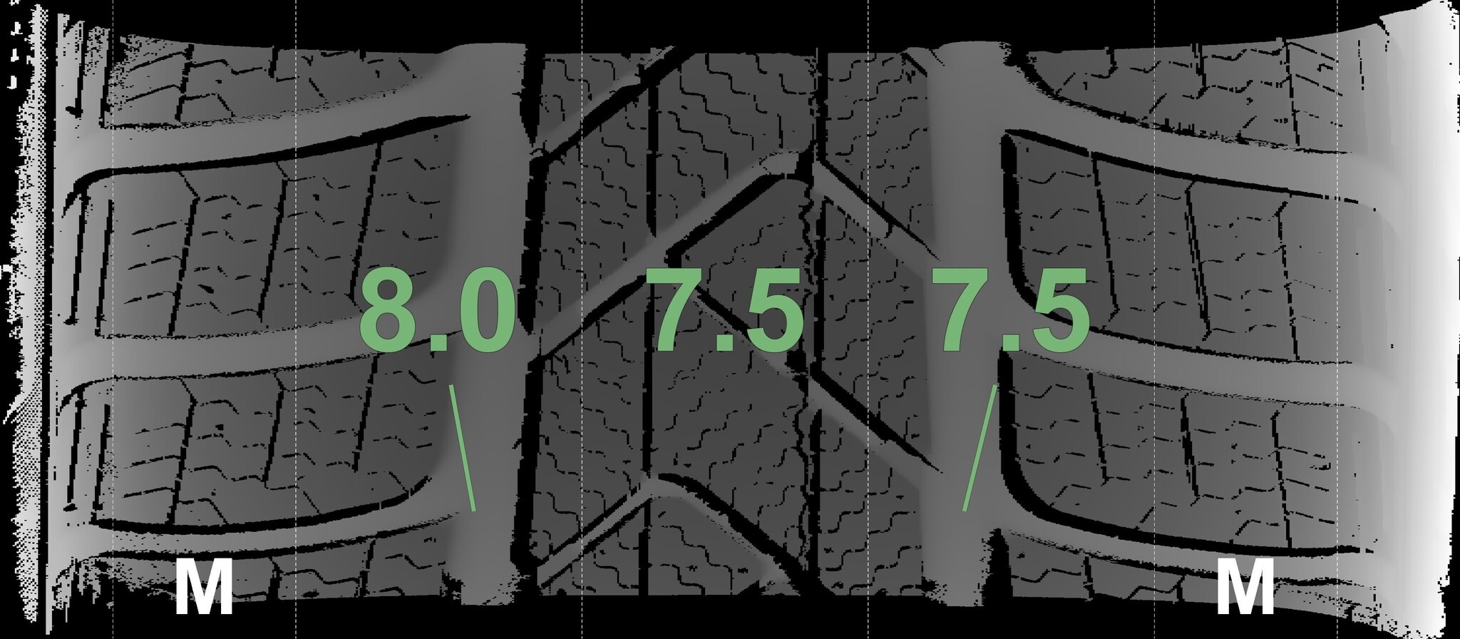 | Zustand | Profiltiefe | DOT | Vorderachse Rechts | Neu | 7.3 mm | 4425 |