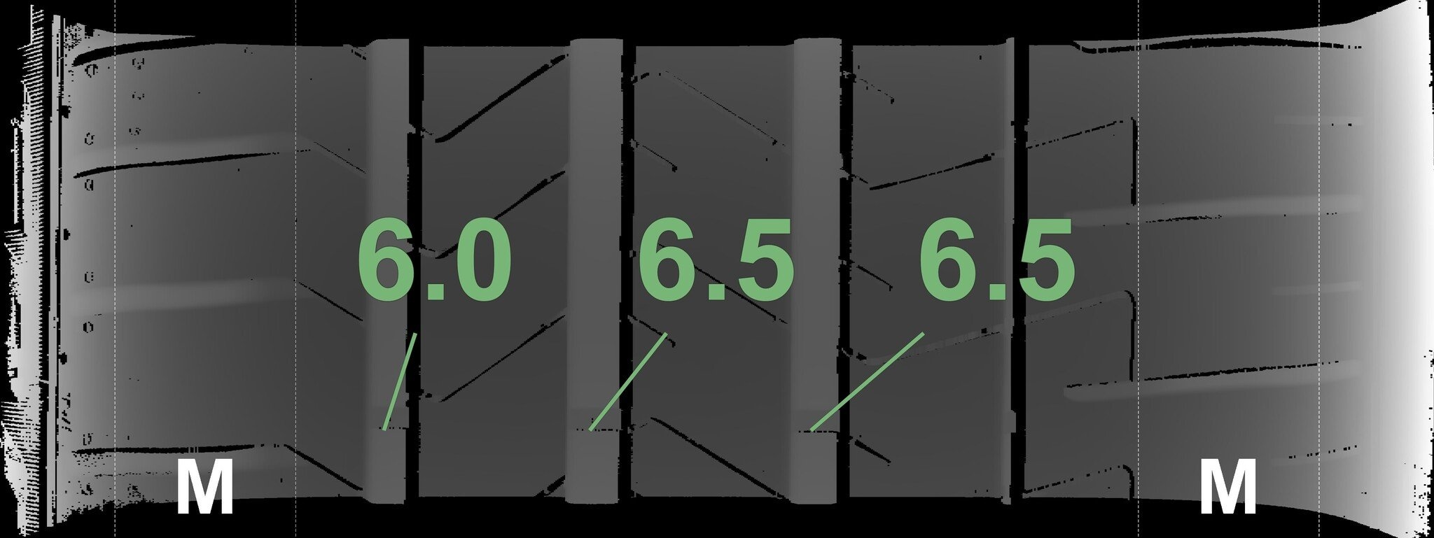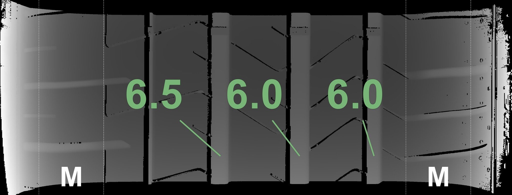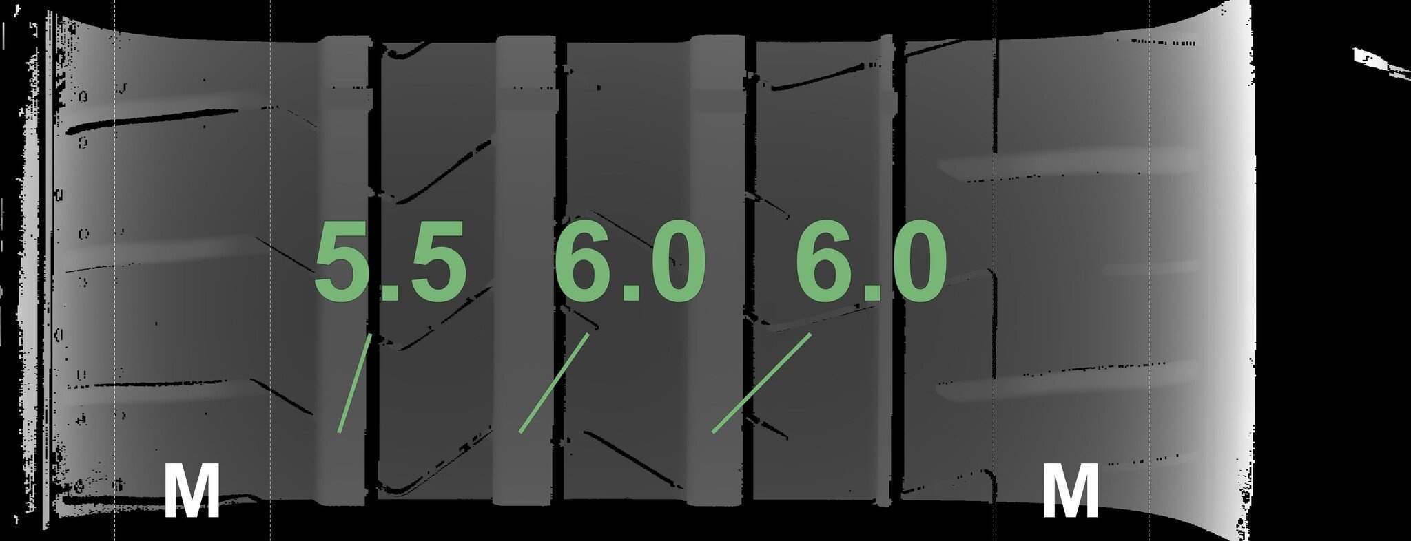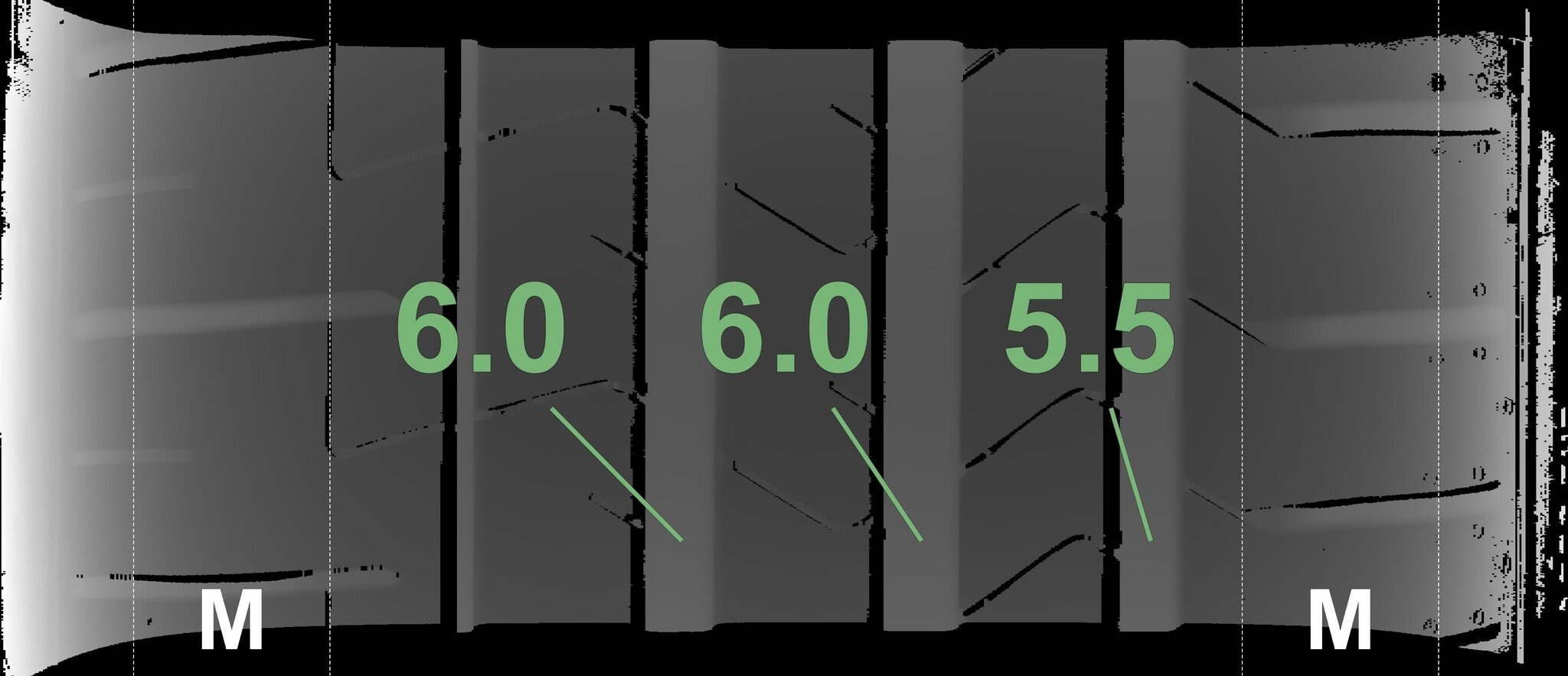Die gemessenen Profiltiefen und Details der Felgen sind oben abgebildet.