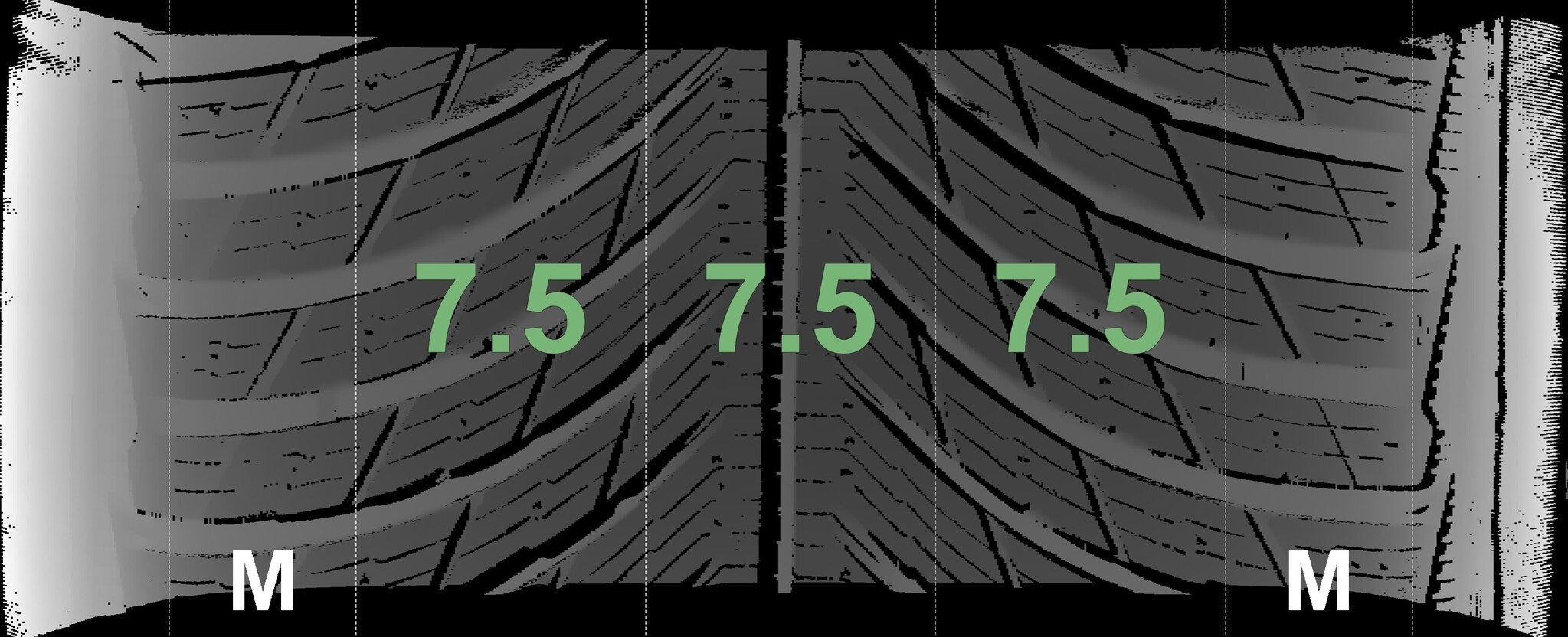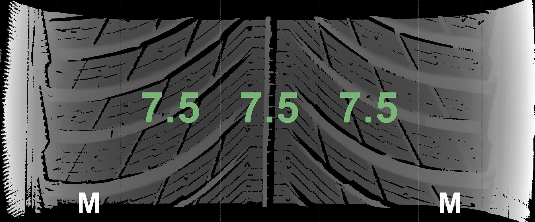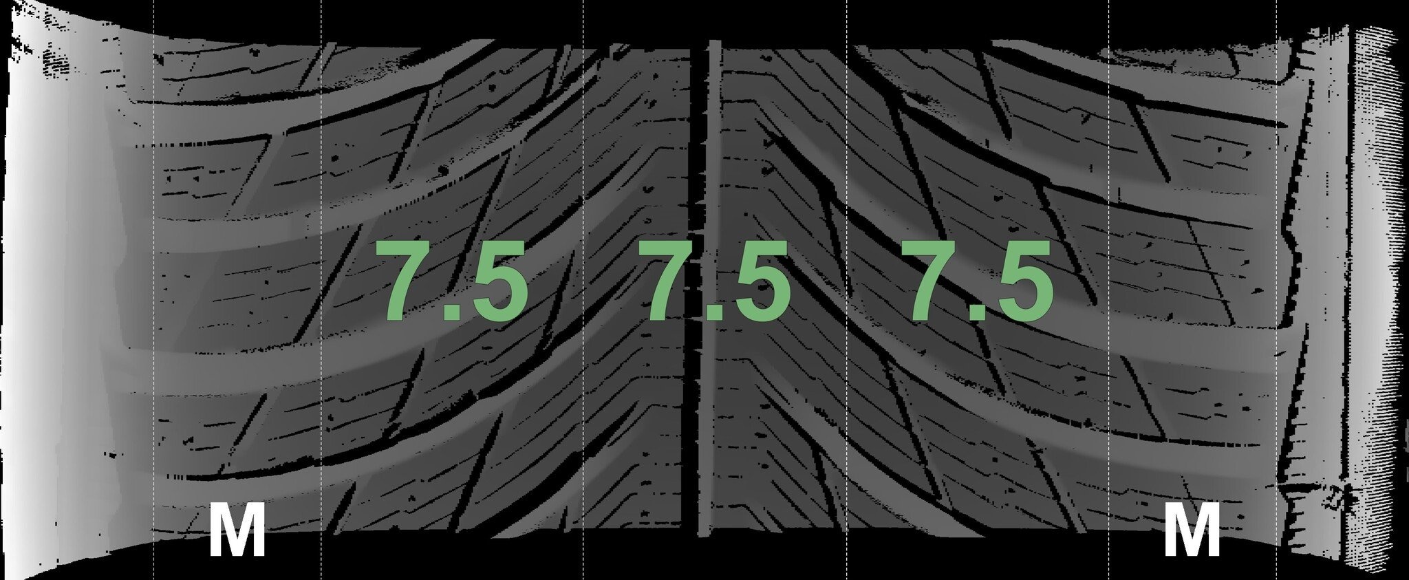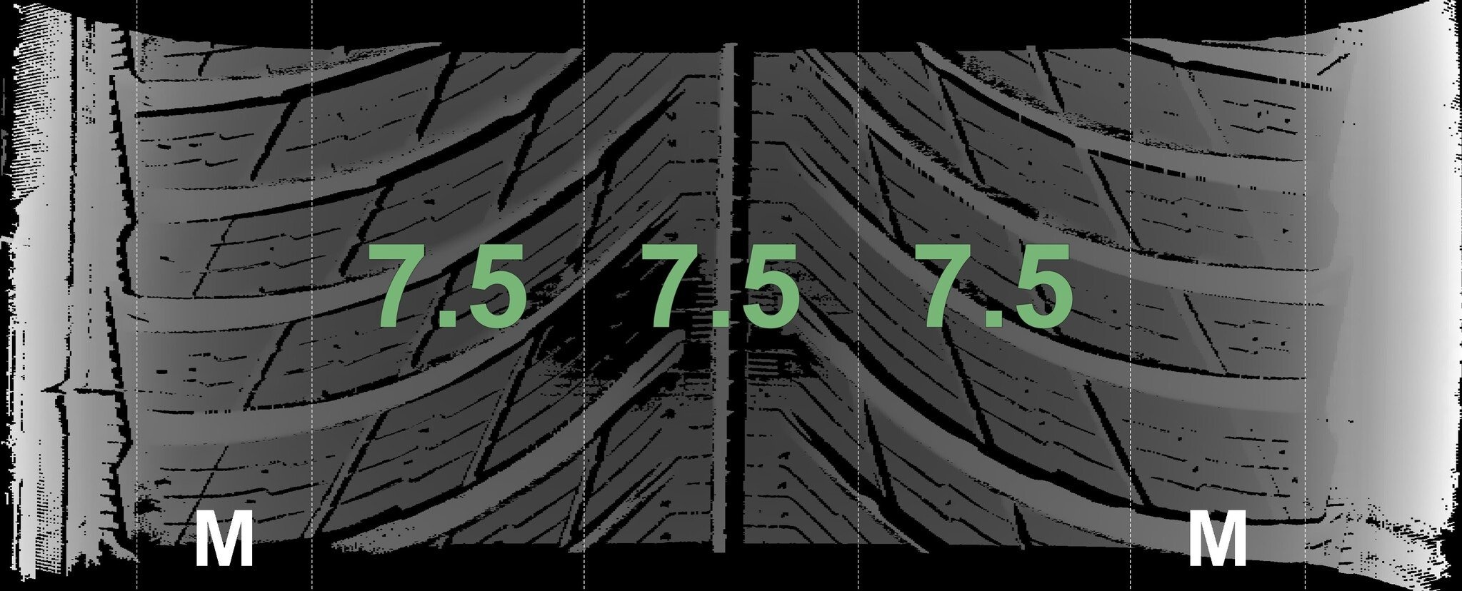| Zustand | Profiltiefe | DOT | Vorderachse Links | Neu | 7,5 mm | 0419 |