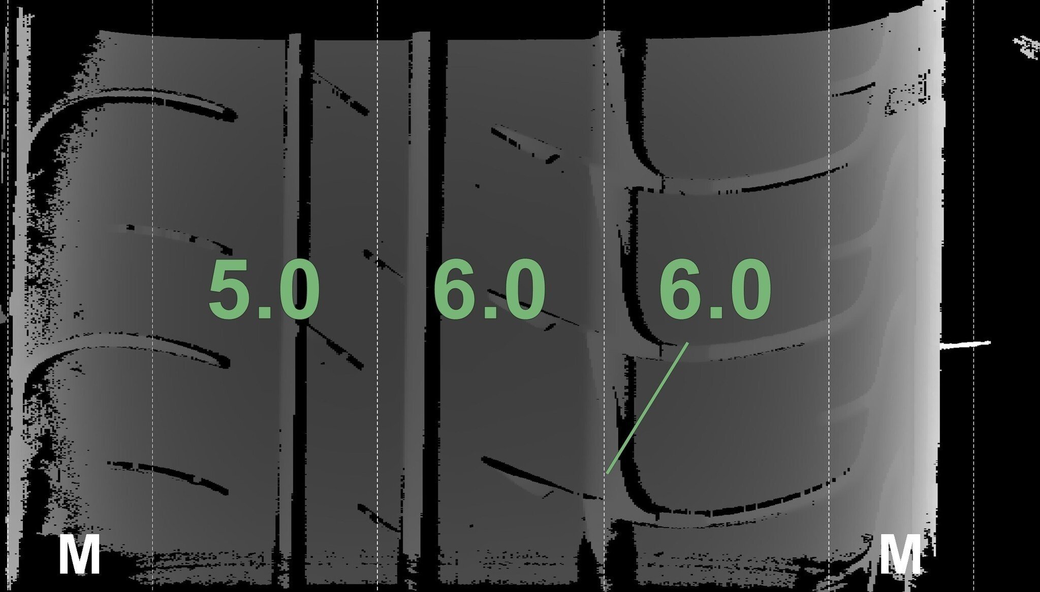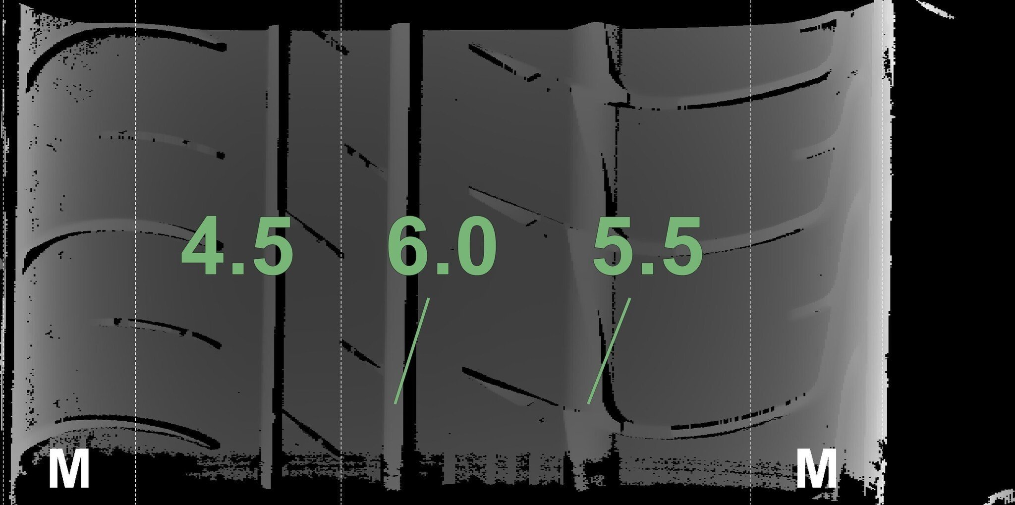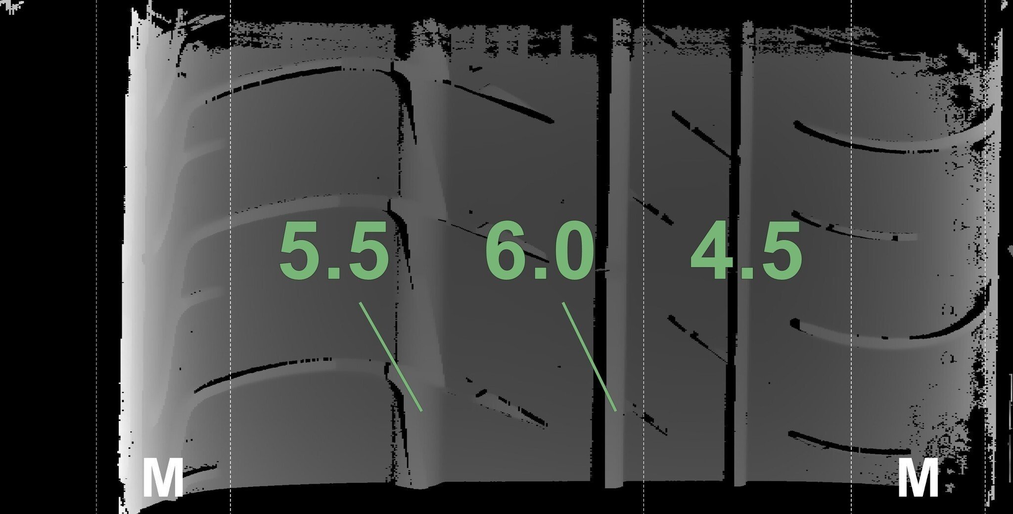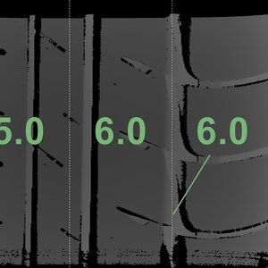 Die gemessenen Profiltiefen und die Details der Felgen sind oben angezeigt.