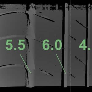 | Zustand | Profiltiefe | DOT | Hinterachse Links | Neu | 5.3 mm | 3623 |