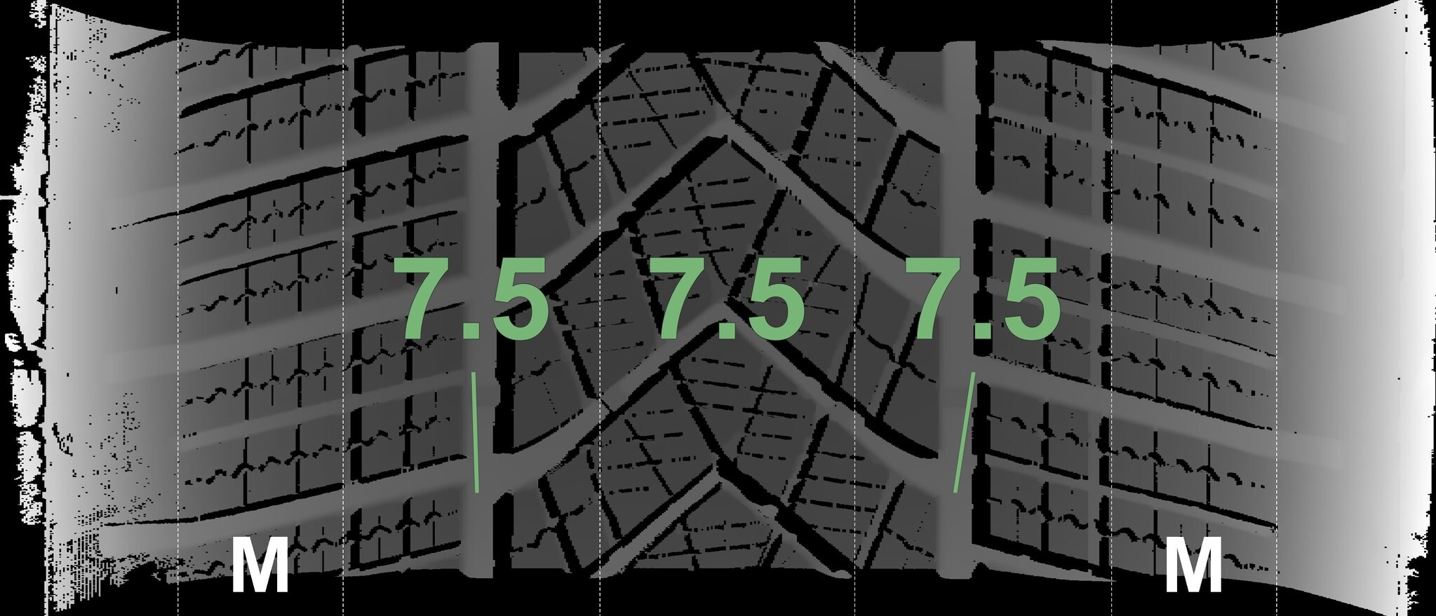 | Zustand | Profiltiefe | DOT | Vorderachse Links | Neu | 7,5 mm | 3622 |