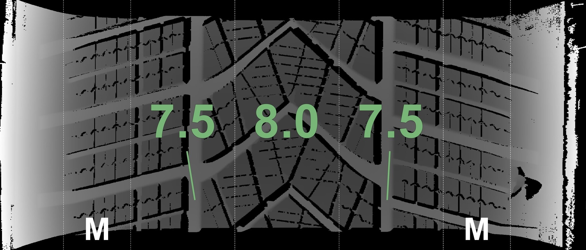 | Zustand | Profiltiefe | DOT | Vorderachse Rechts | Neu | 7,5 mm | 3622 |