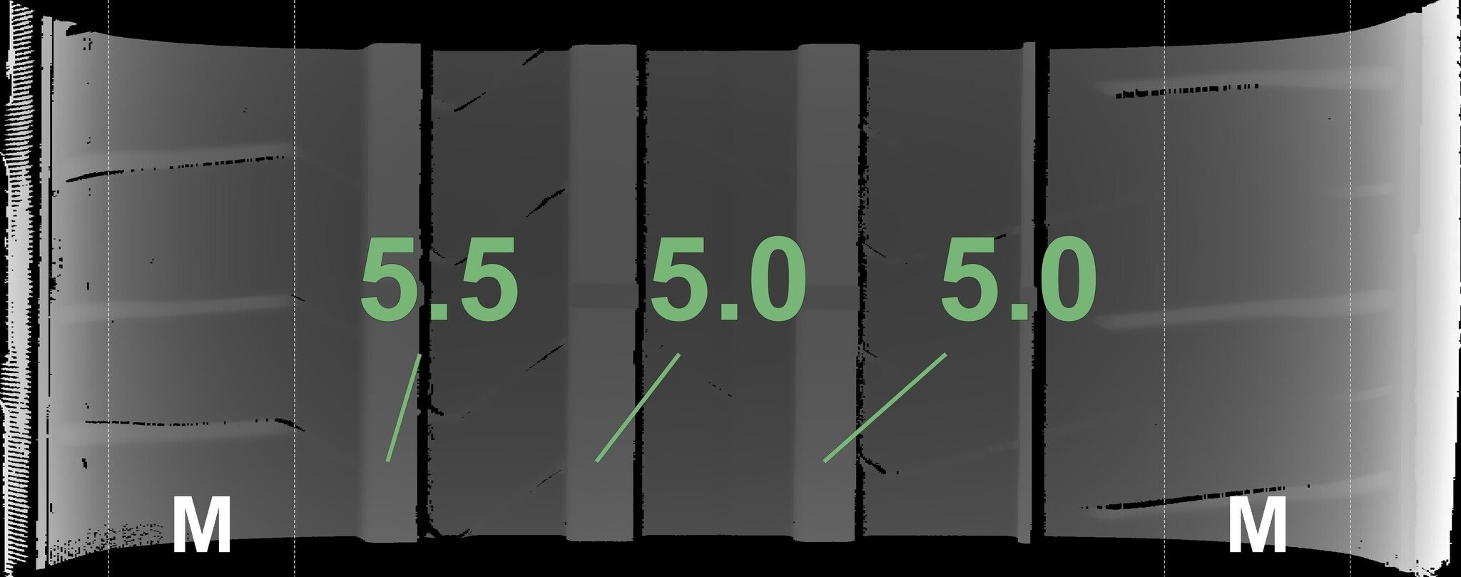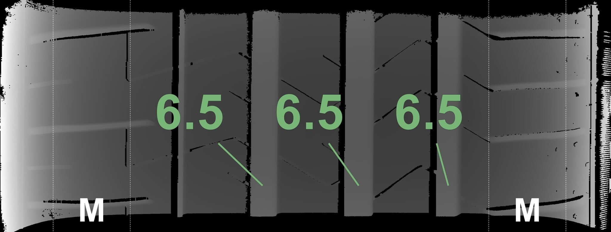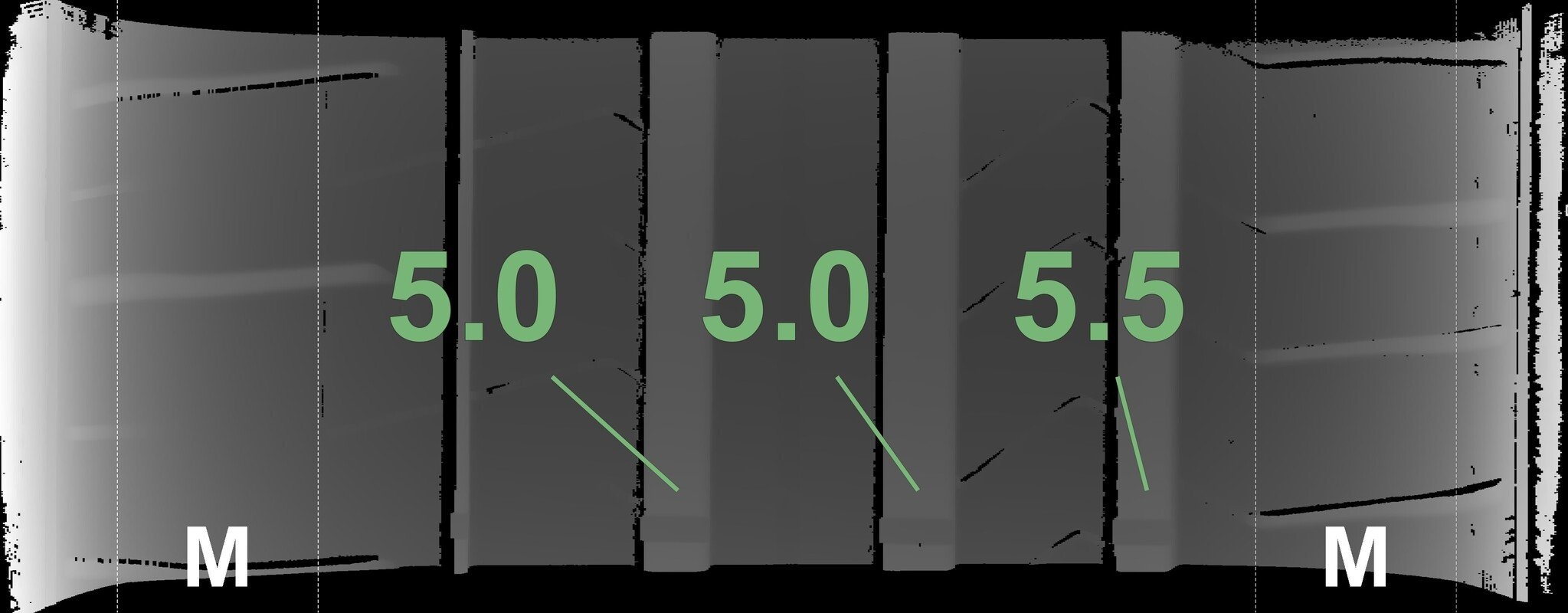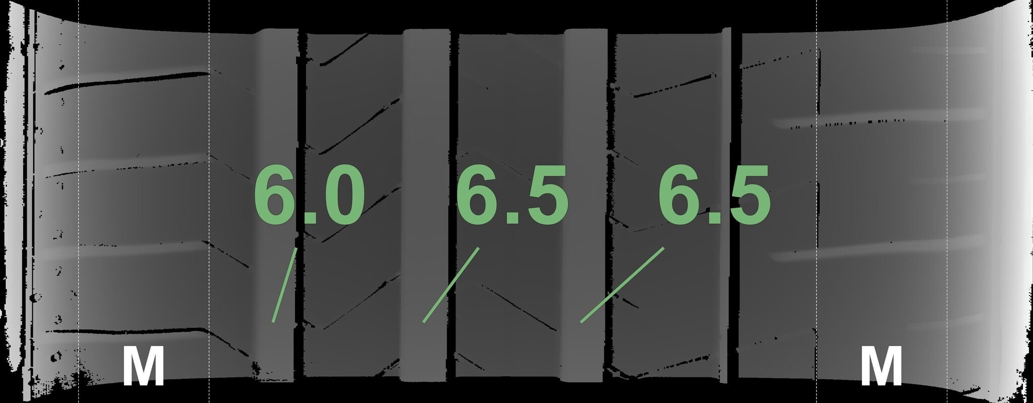 Die gemessenen Profiltiefen und die Details der Felgen sind oben dargestellt.