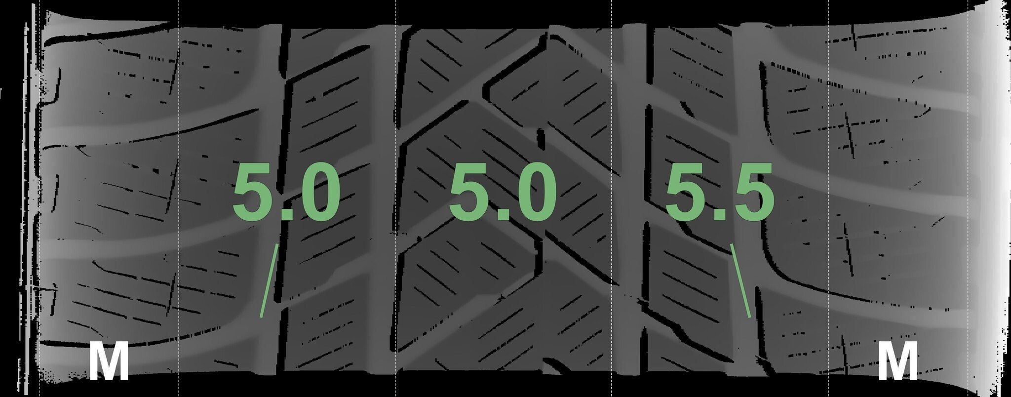 Die gemessenen Profiltiefen und die Details der Felgen sind oben dargestellt.