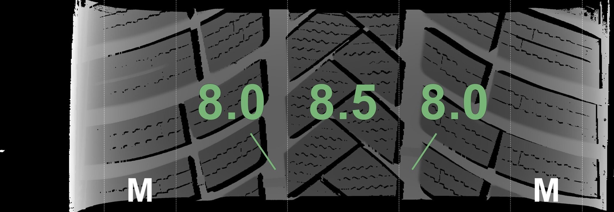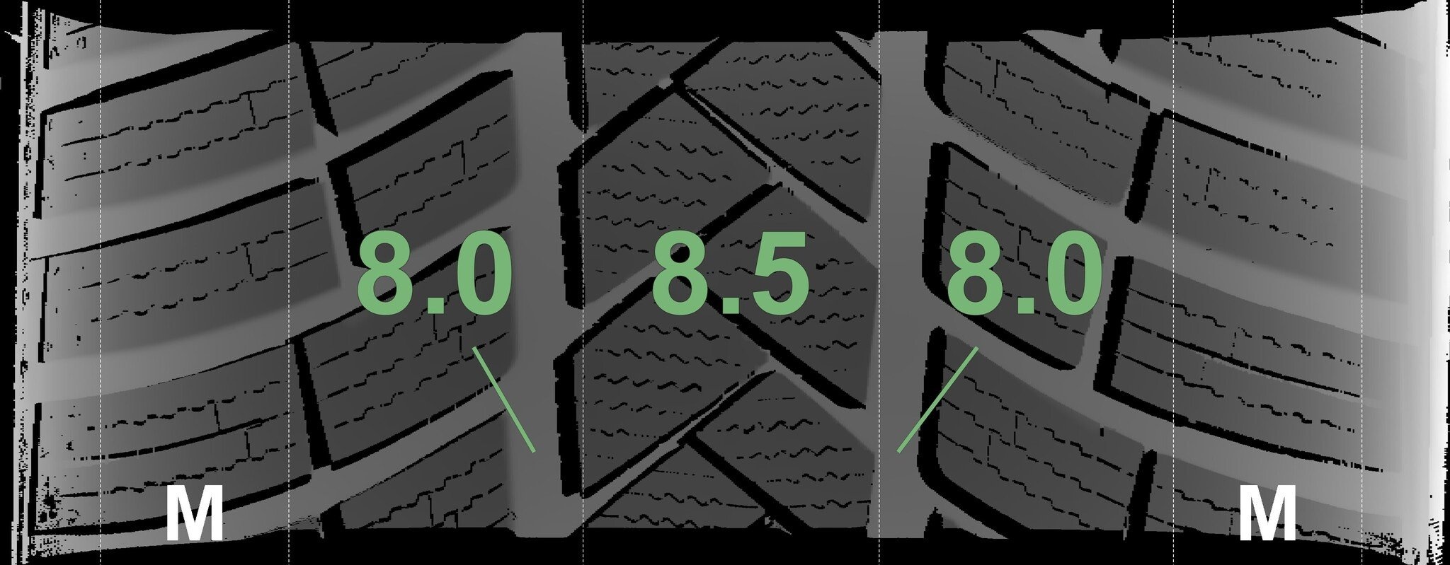 | Zustand | Profiltiefe | DOT | Vorderachse Rechts | Demo Noppen noch sichtbar | 8.2 mm | 2723 |