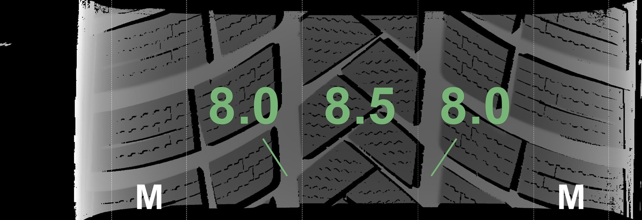 | Zustand | Profiltiefe | DOT | Vorderachse Links | Demo-Noppen noch sichtbar | 8.2 mm | 2723 |