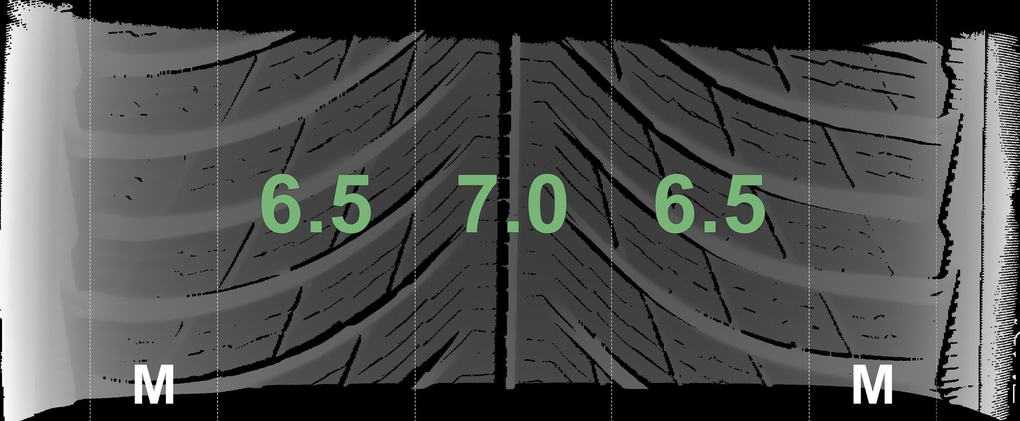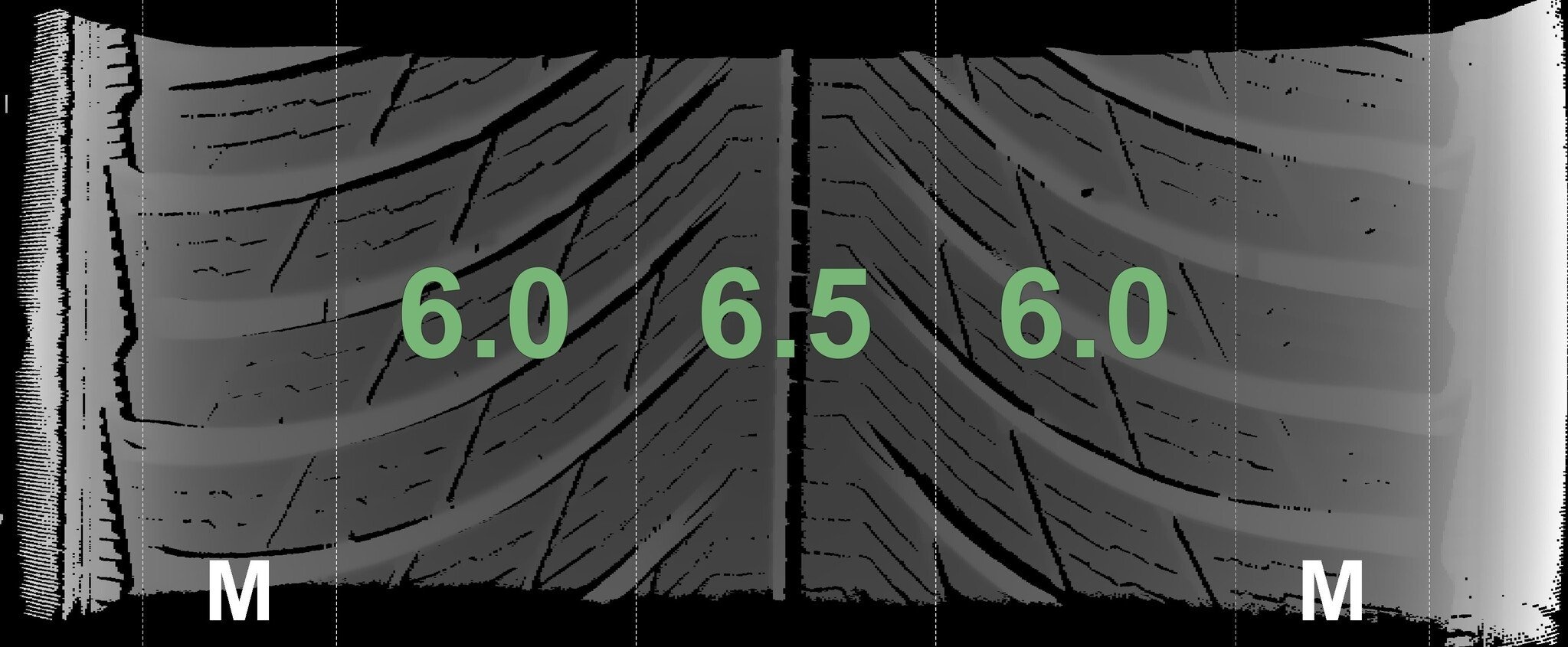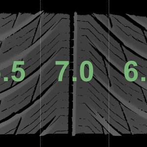 Die gemessenen Profiltiefen und die Details der Felgen sind oben dargestellt.