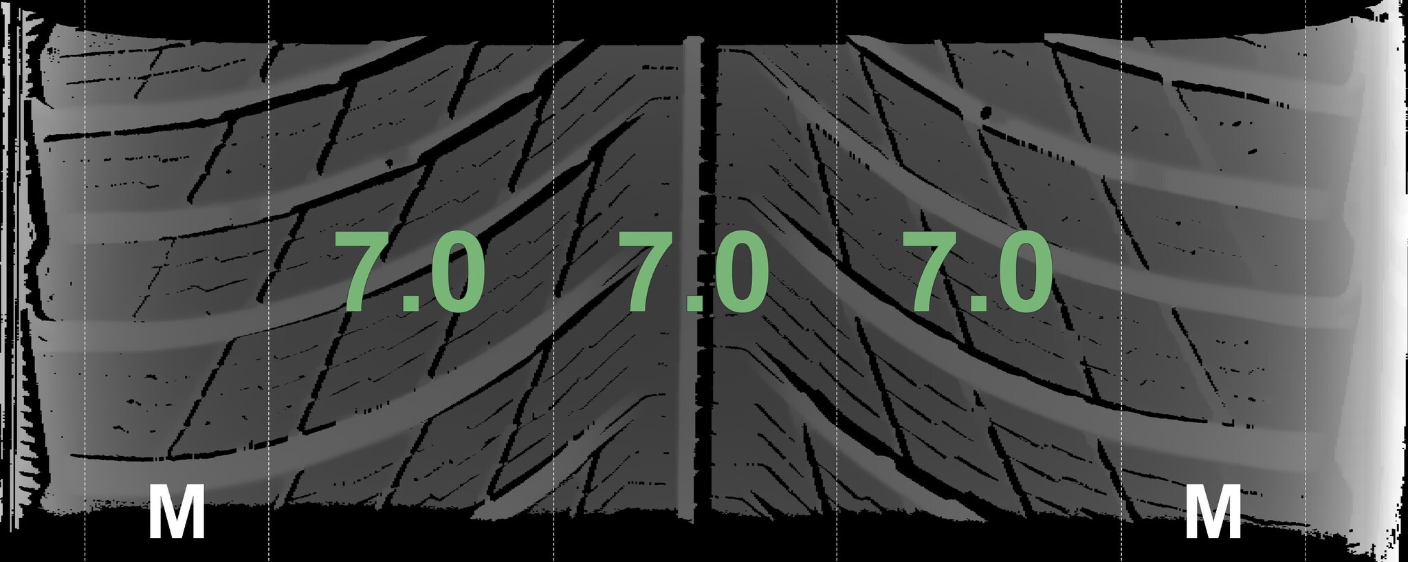 Die gemessenen Profiltiefen und die Details der Felgen sind oben dargestellt.