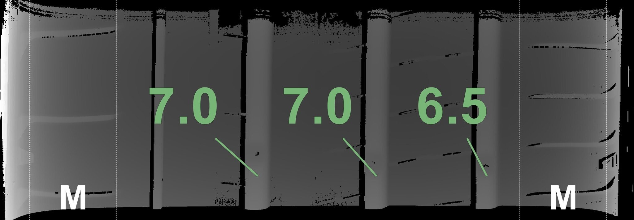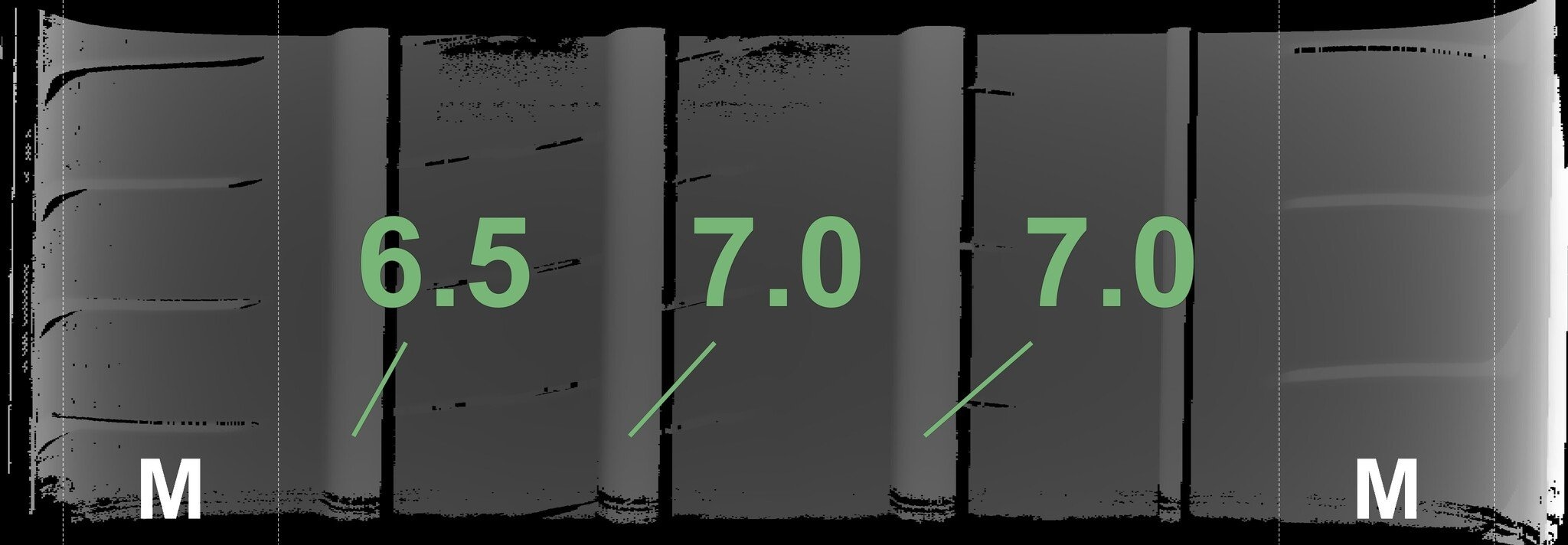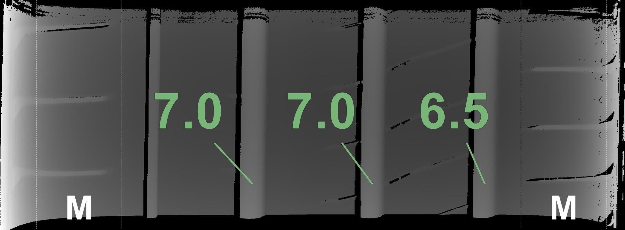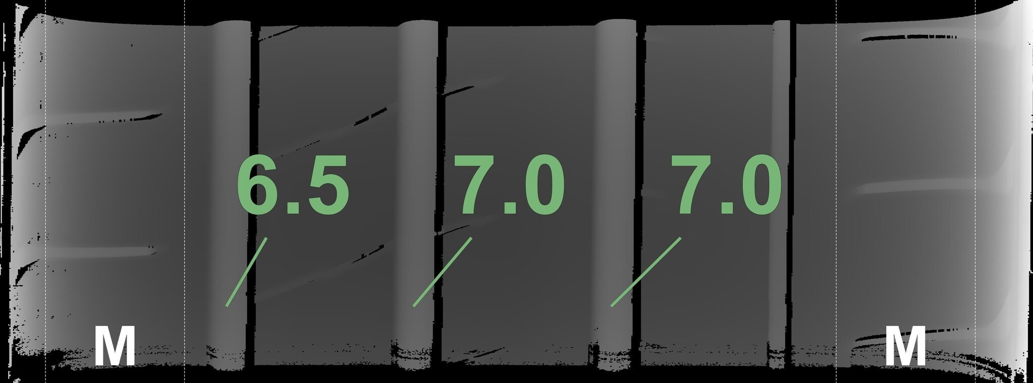 Die gemessenen Profiltiefen und die Details der Felgen sind oben dargestellt.
