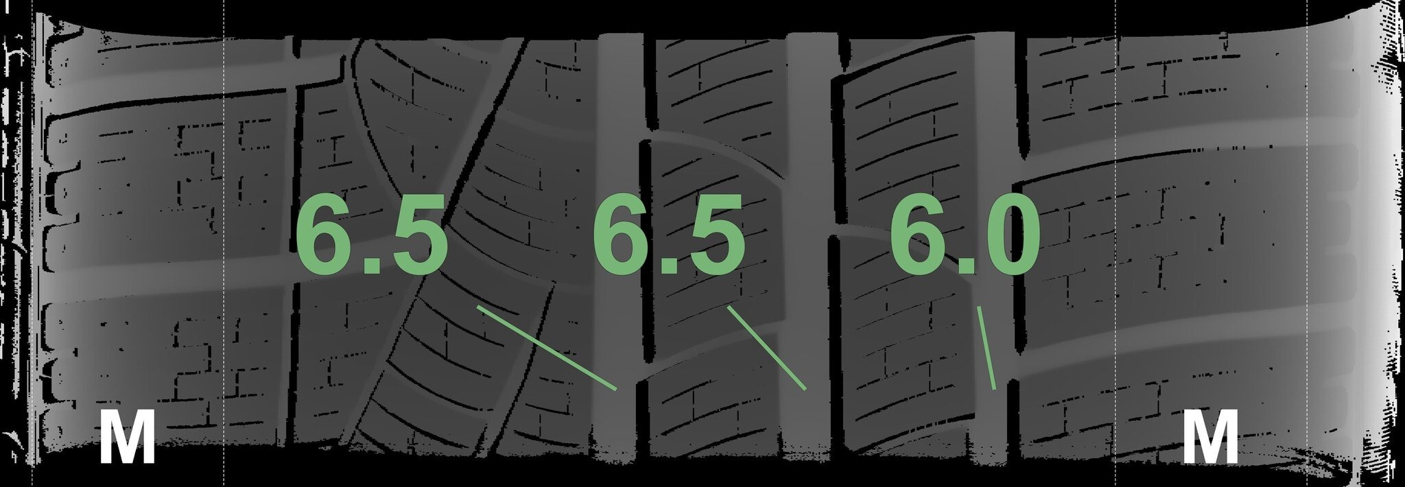 Die gemessenen Profiltiefen und die Details der Felgen sind oben dargestellt.