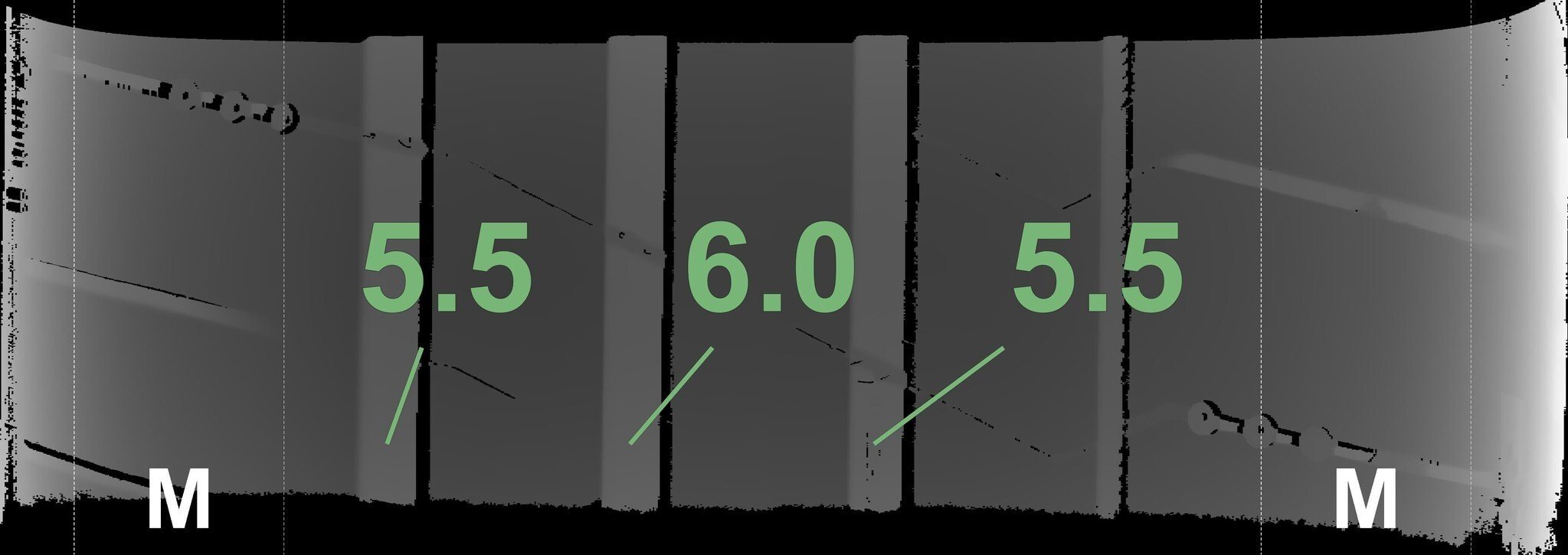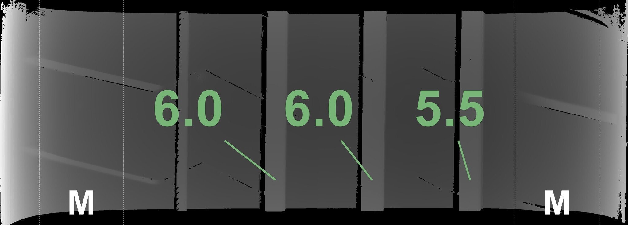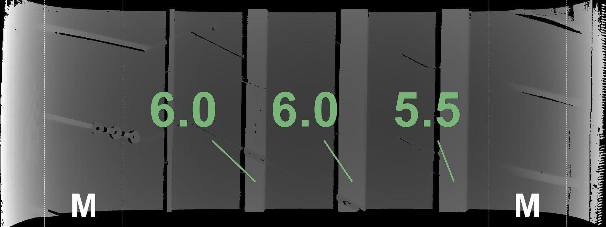 Die gemessenen Profiltiefen und die Details der Felgen sind oben dargestellt.