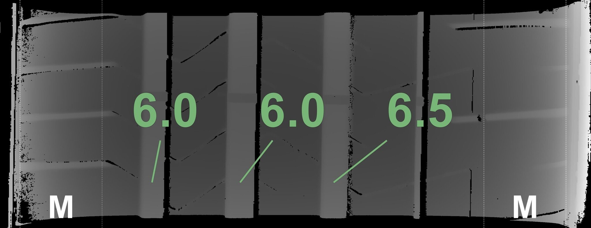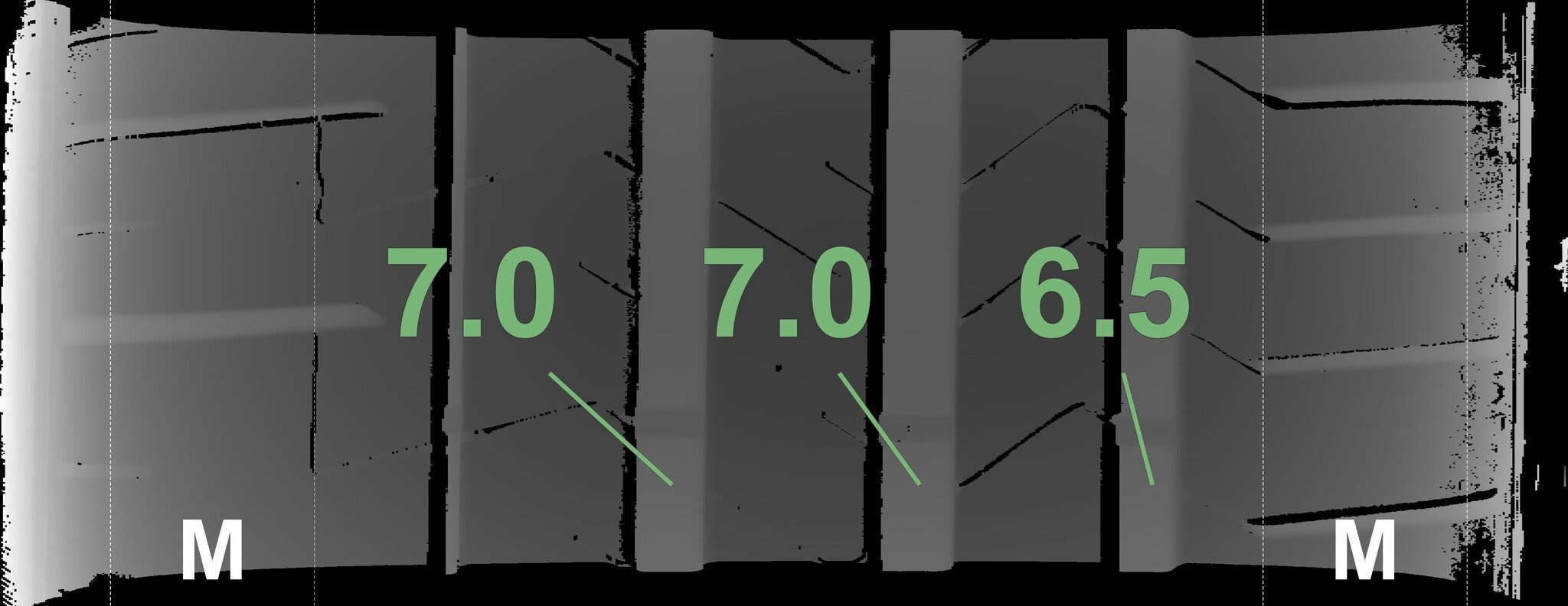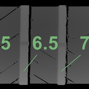 Die gemessenen Profiltiefen und die Details der Felgen sind oben dargestellt.
