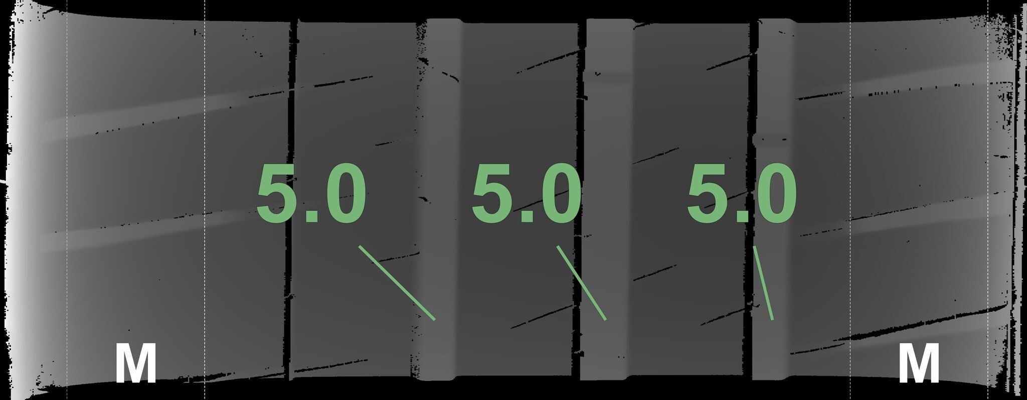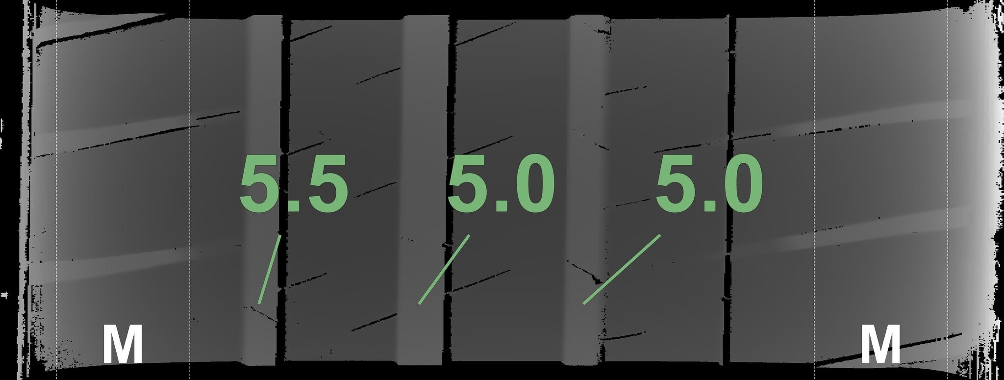Die gemessenen Profiltiefen und die Details der Felgen sind oben dargestellt.