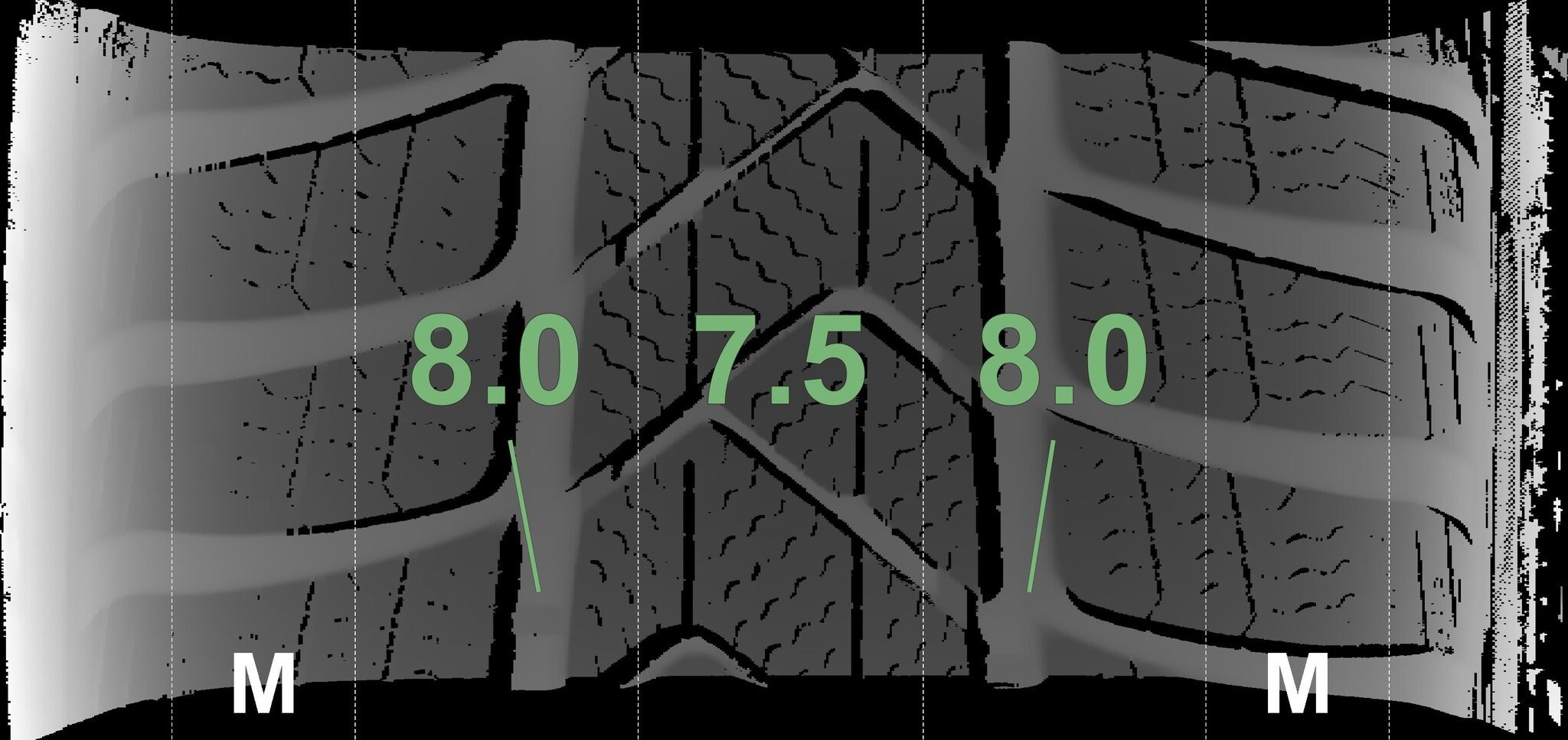 Die gemessenen Profiltiefen und die Details der Felgen sind oben angezeigt.